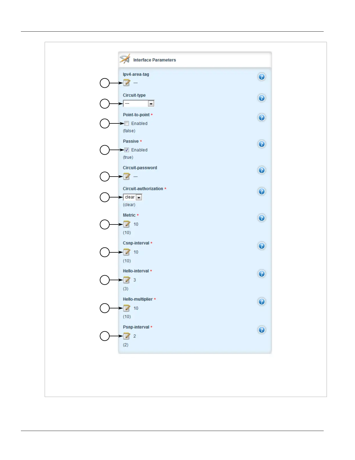 6. Circuit Authorization List 7. Metric Box 8. CSNP Interval Box 9. Hello Interval Box 10. Hello Multiplier Box 11. PSNP