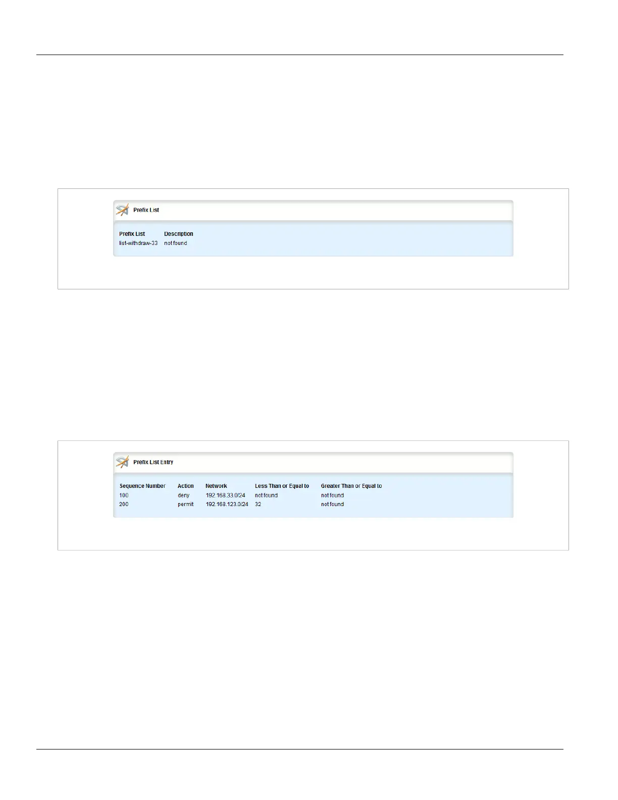entry, where {name} is the name of the prefix list. If entries have been configured, the Prefix List Entry table