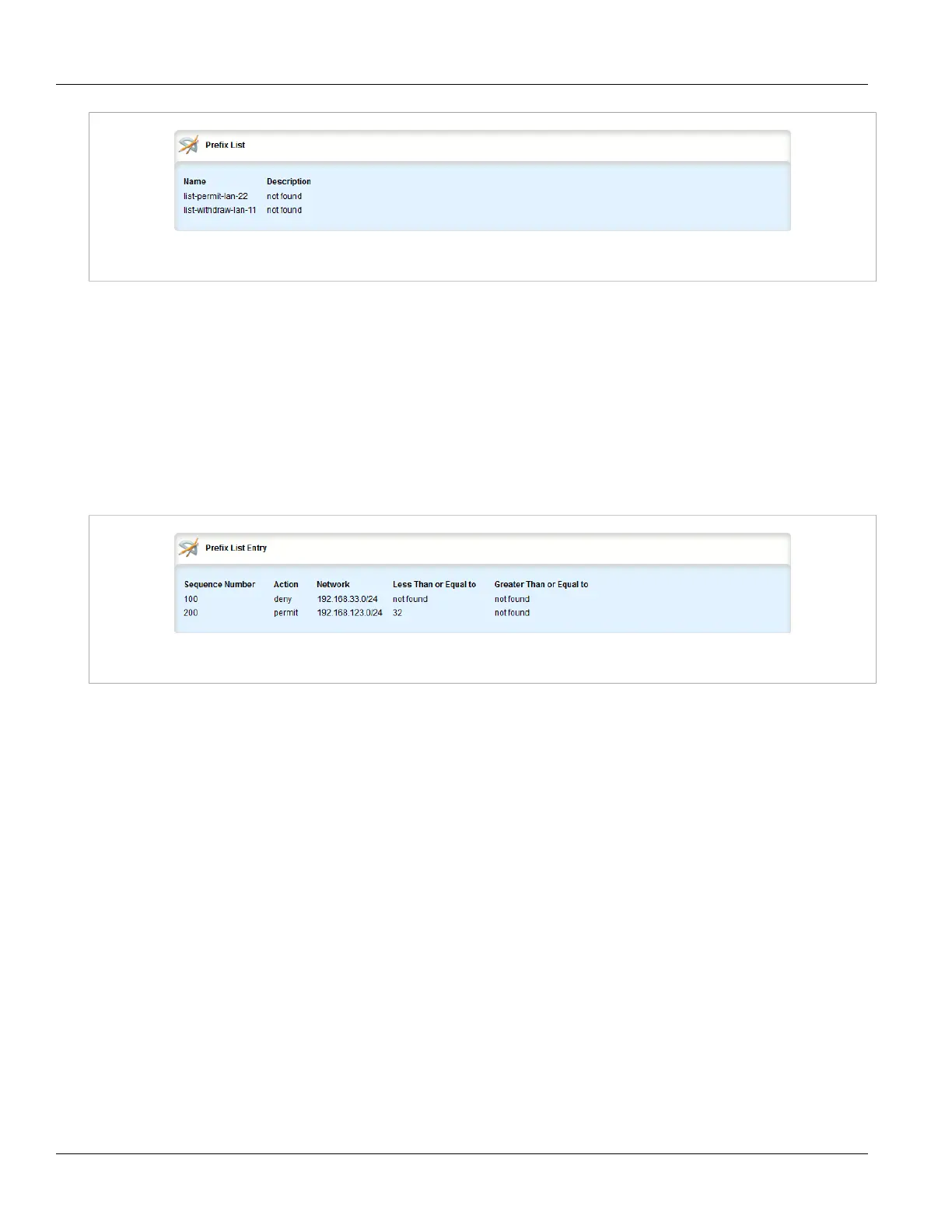 entry, where {name} is the name of the prefix list. If entries have been configured, the Prefix List Entry table
