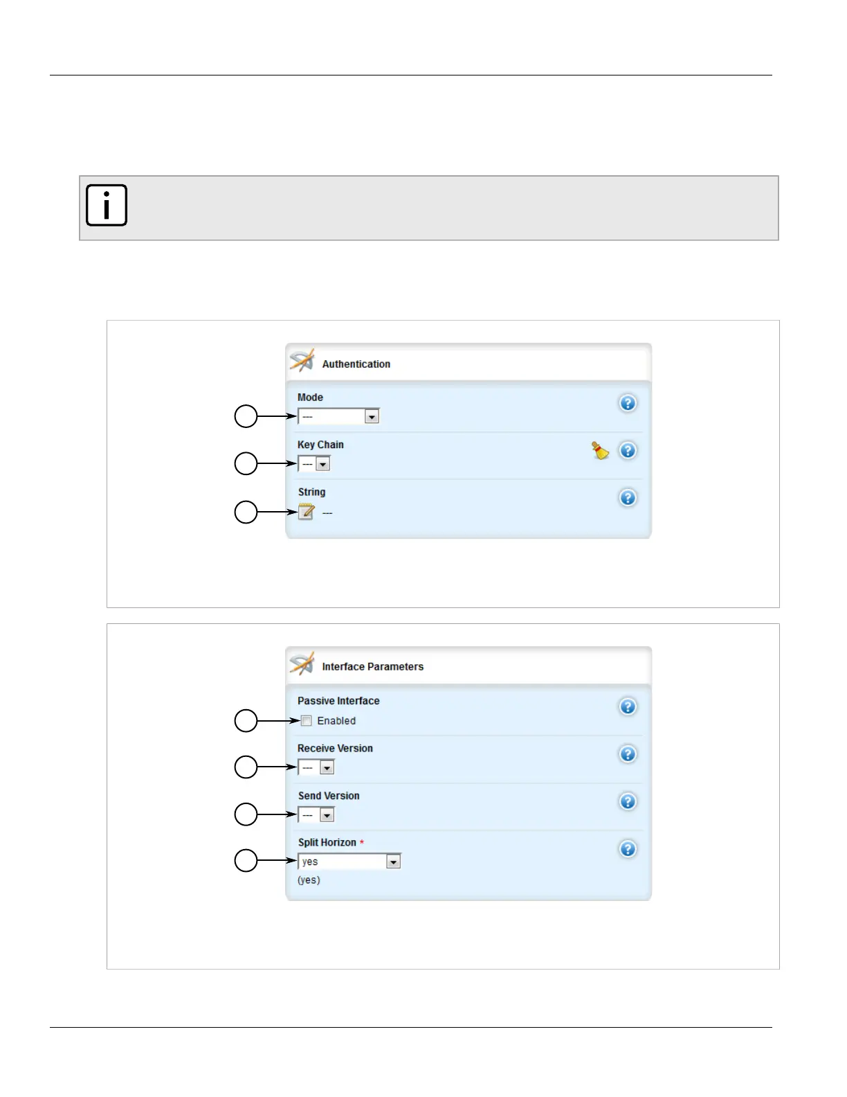 1. Passive Interface Check Box 2. Receive Version List 3. Send Version List 4. Split Horizon List