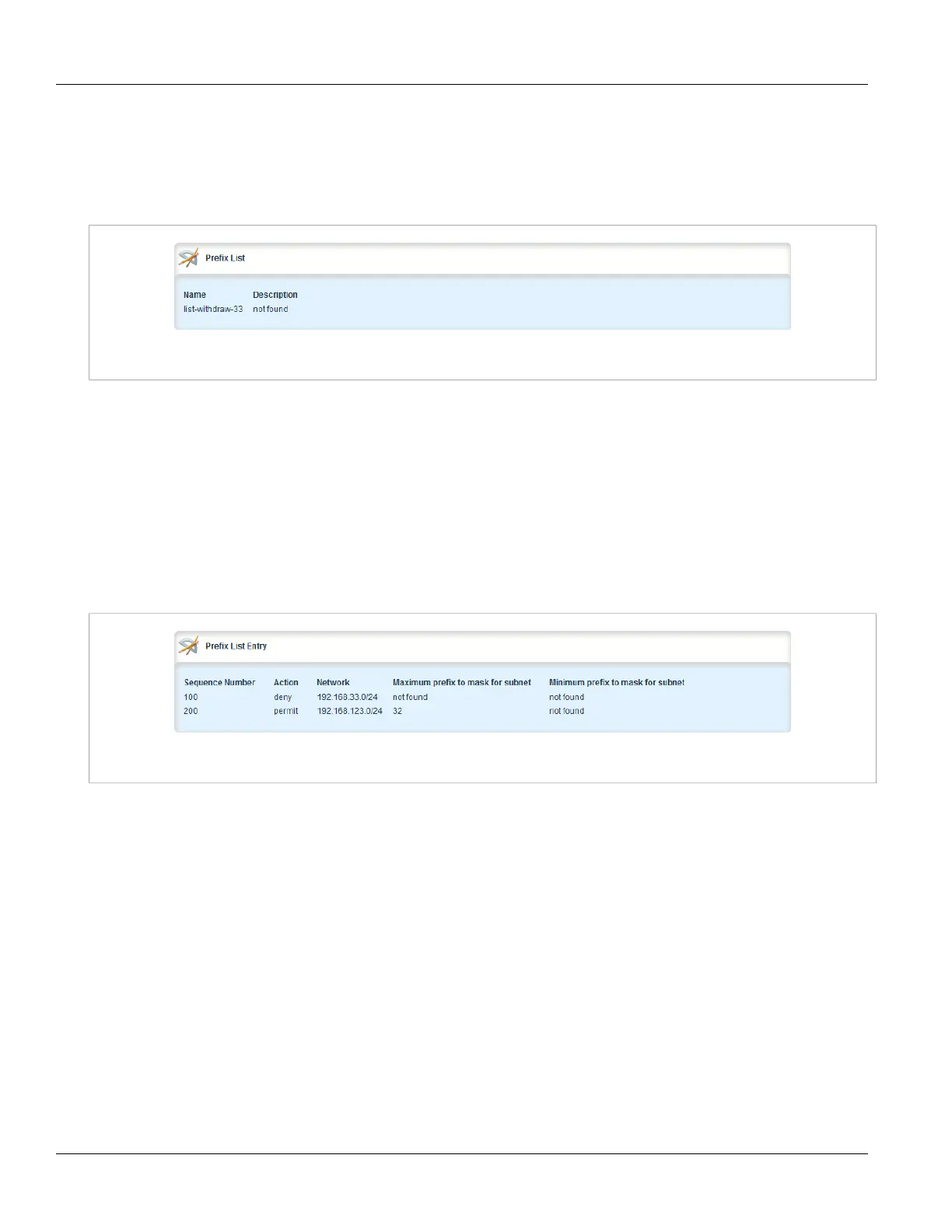 entry, where {name} is the name of the prefix list. If entries have been configured, the Prefix List Entry table