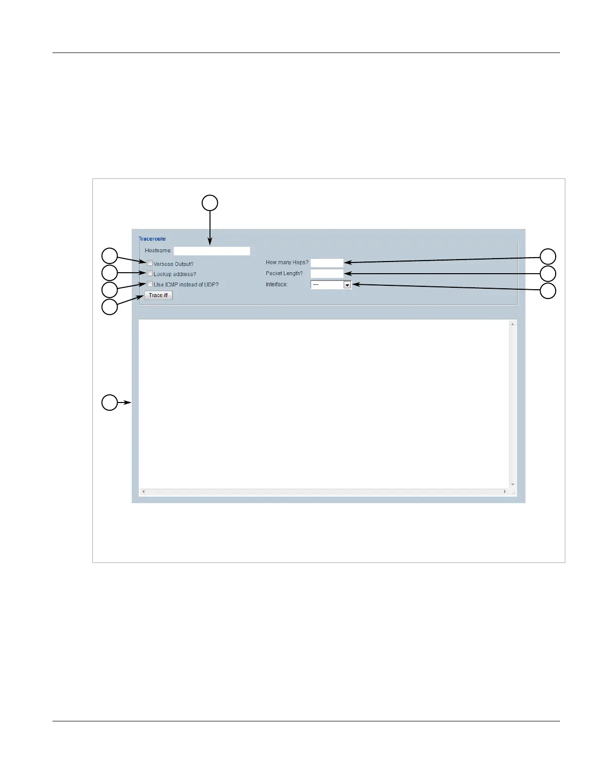1. Hostname Box 2. Verbose Output Check Box 3. Lookup Address Check Box 4. Use ICMP Instead of UDP Check Box