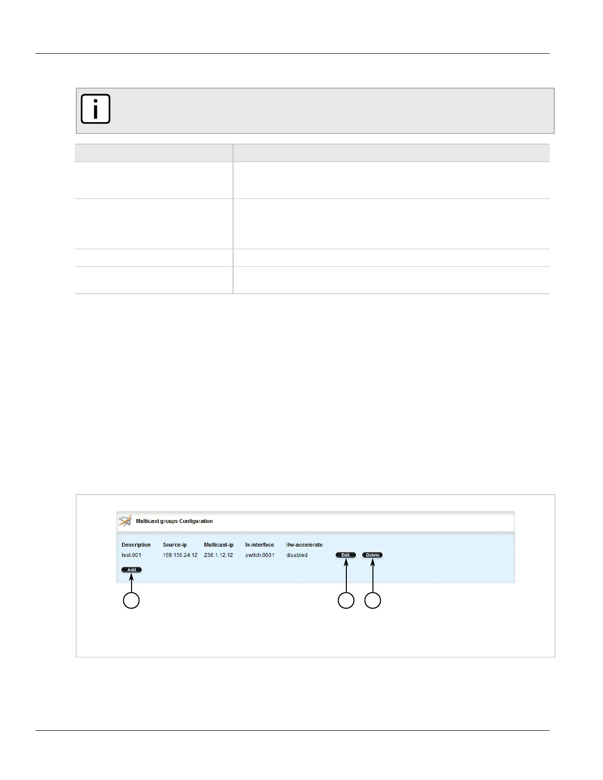 2. Navigate to routing » multicast » static » mcast-groups. The Multicast Groups Configuration table