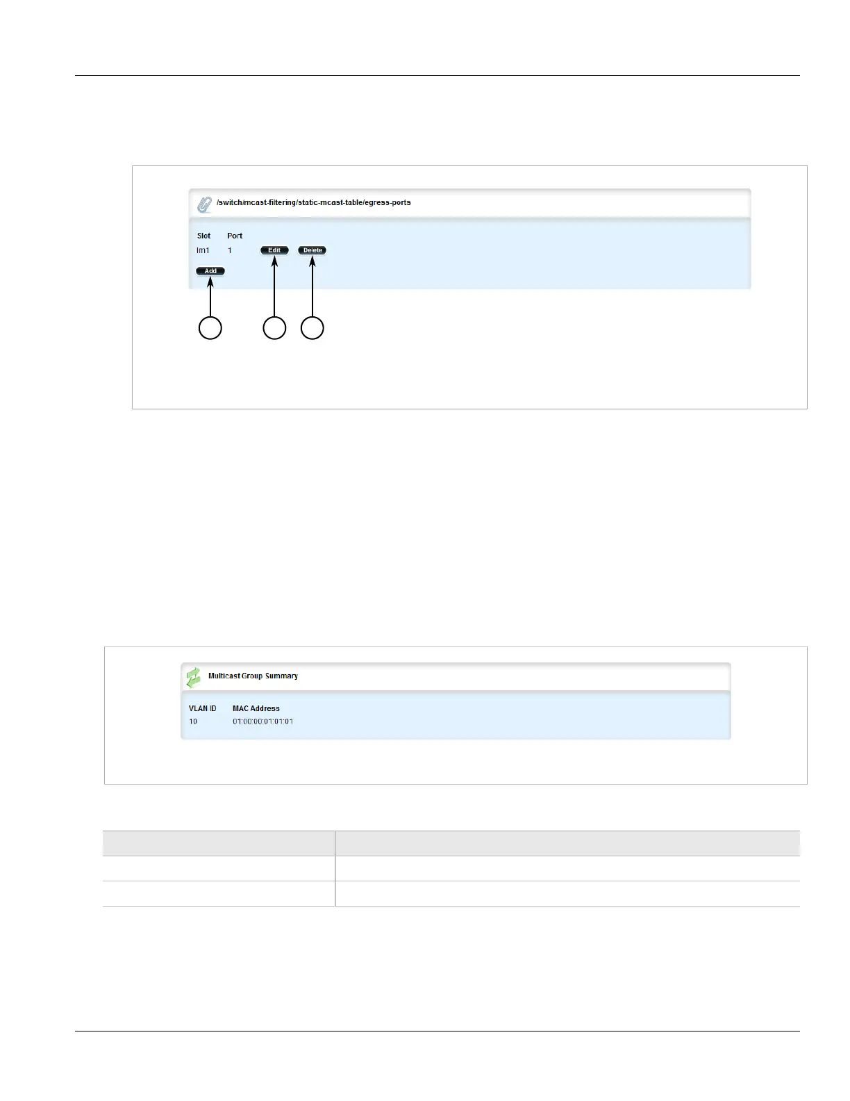 2. Navigate to switch » mcast-filtering » static-mcast-table » {id/address} » egress-ports, where {id/