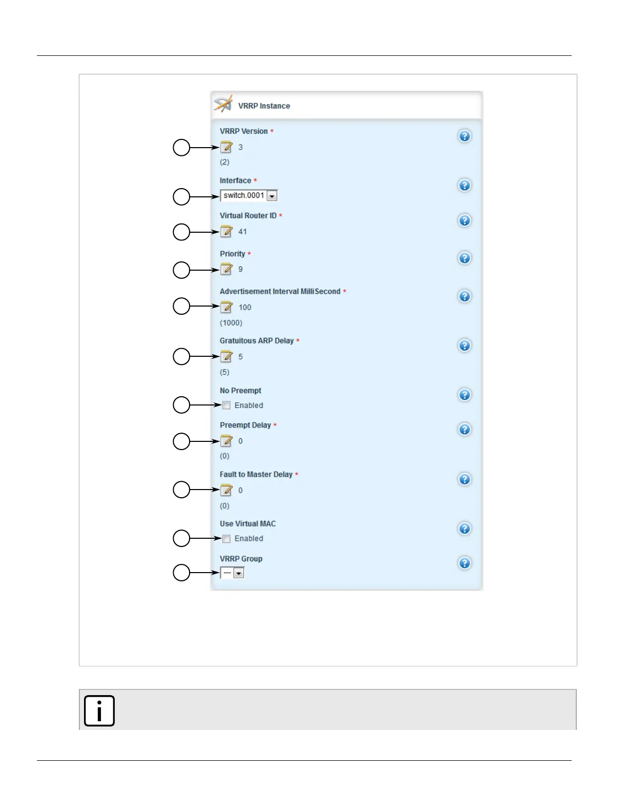 1. VRRP Version 2. Interface List 3. Virtual Router ID Box 4. Priority Box 5. Advertisement Interval Box 6. Gratuitous