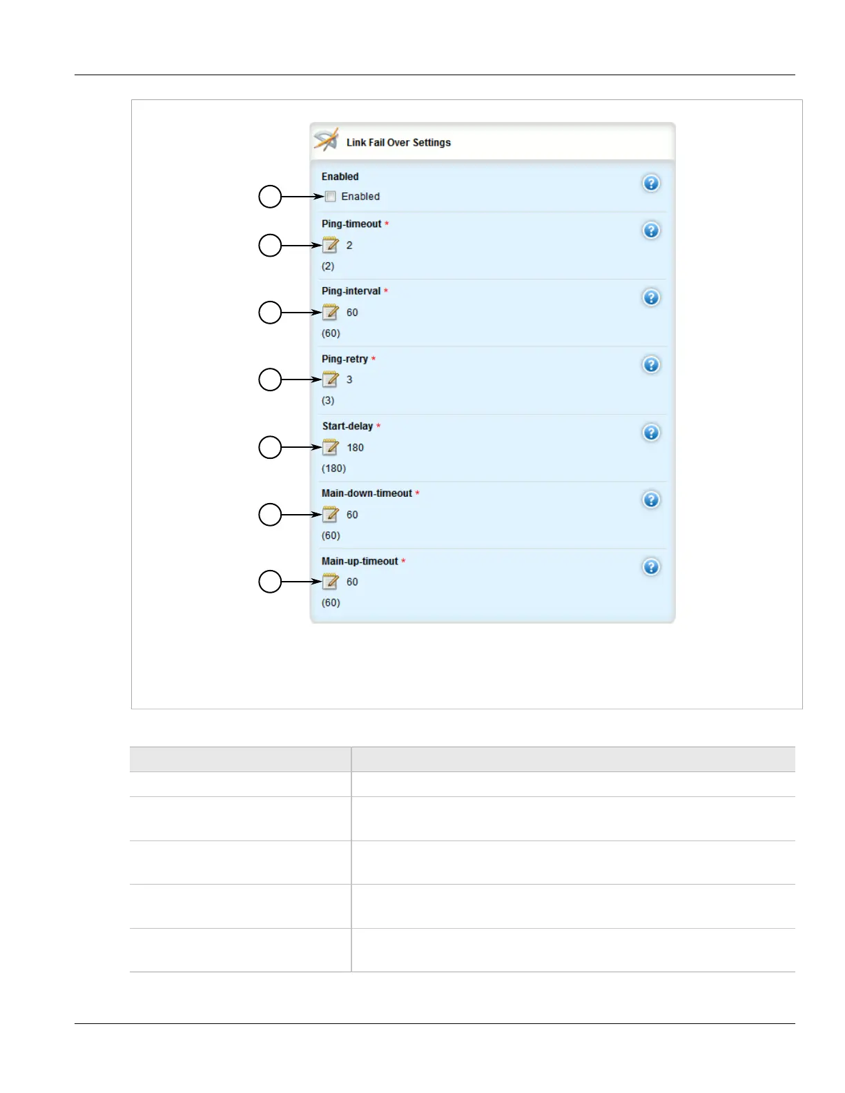 1. Enabled Check Box 2. Ping Timeout Box 3. Ping Interval Box 4. Ping Retry Box 5. Start Delay Box 6. Main Down Timeout