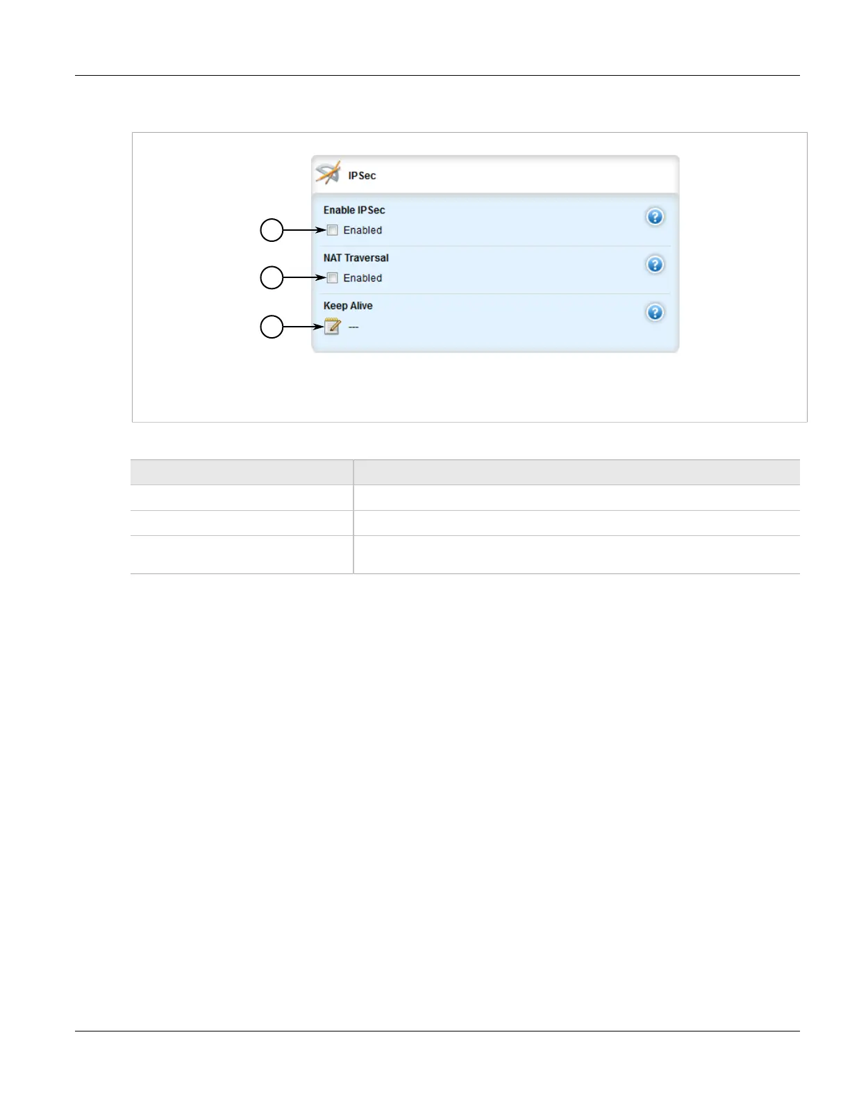 1. Enable IPsec Check Box 2. NAT Traversal Check Box 3. Keep Alive Box