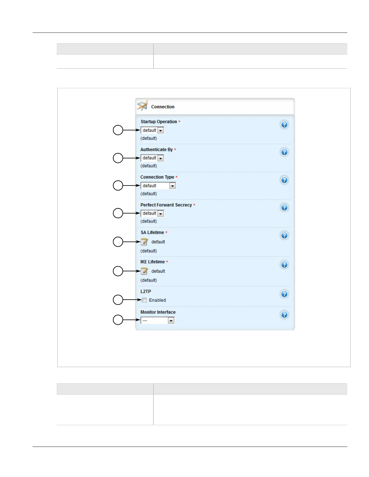 1. Startup Operation List 2. Authenticate By List 3. Connection Type List 4. Perfect Forward Secrecy List 5. SA Lifetime Box