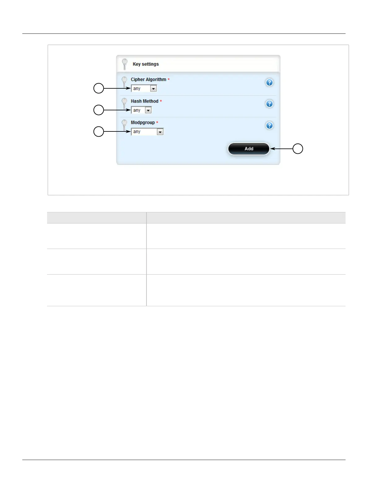 1. Cipher Algorithm Box 2. Hash Method Box 3. Mod Group Box 4. Add Button