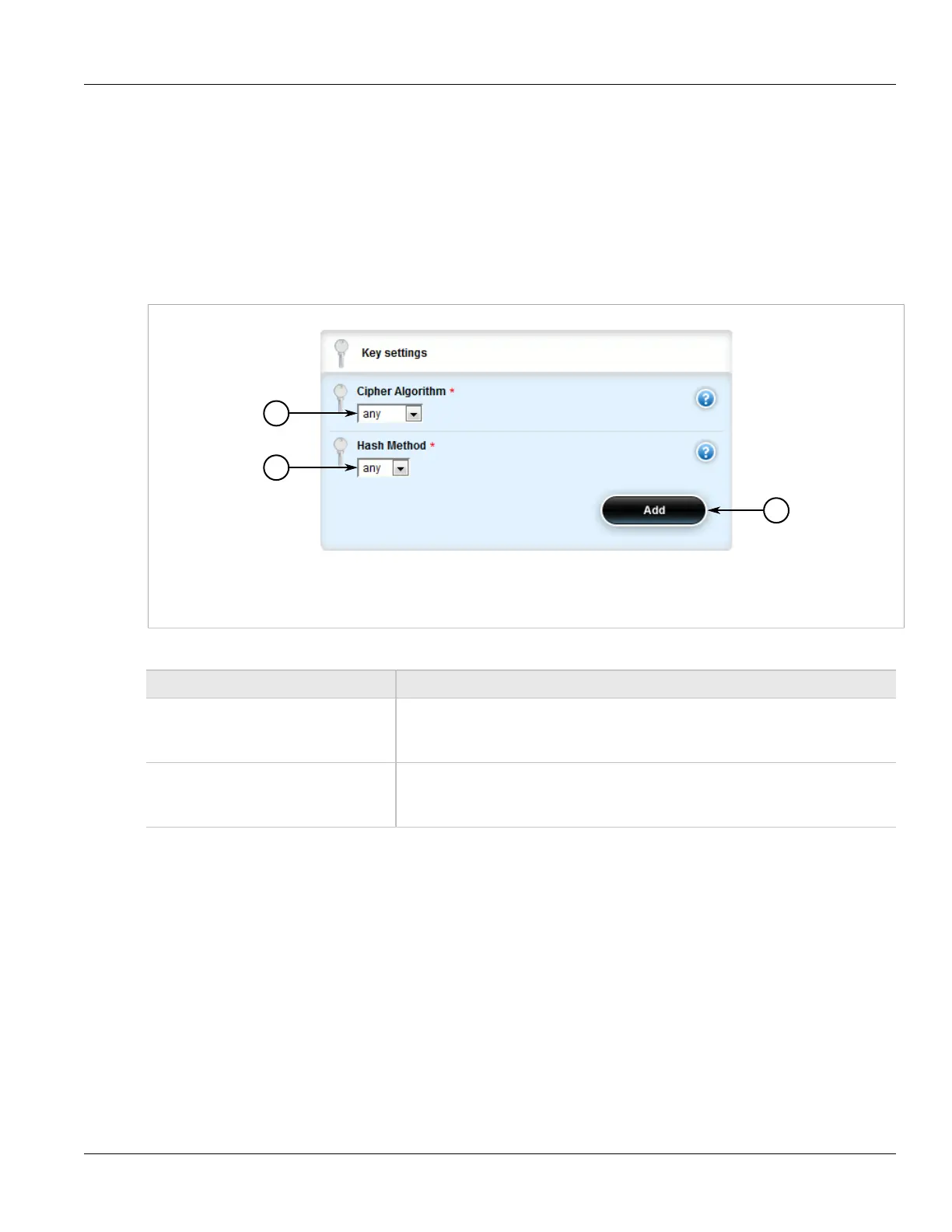 1. Cipher Algorithm Box 2. Hash Method Box 3. Add Button