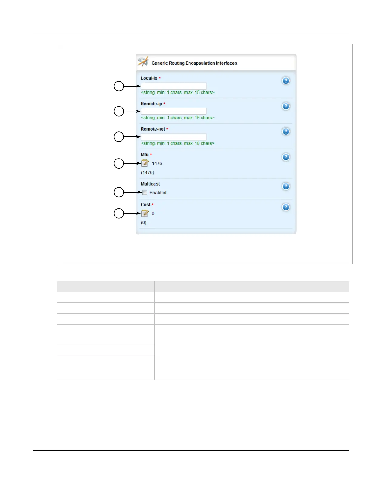 1. Local Address Box 2. Remote Address Box 3. Remote Subnet Box 4. MTU Box 5. Multicast Check Box 6. Cost Box