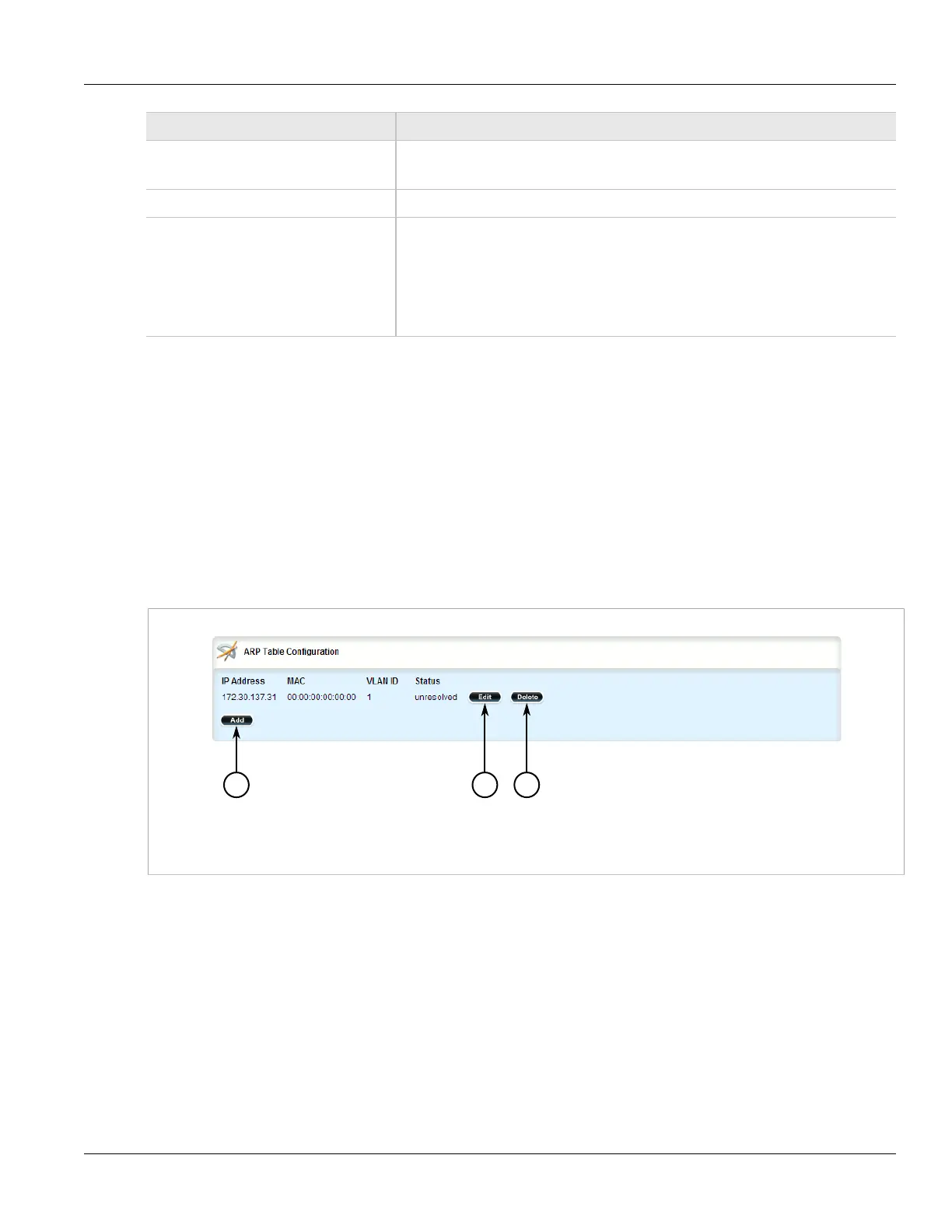 2. Navigate to switch » layer3-switching » arp-table. The ARP Table Configuration table appears.