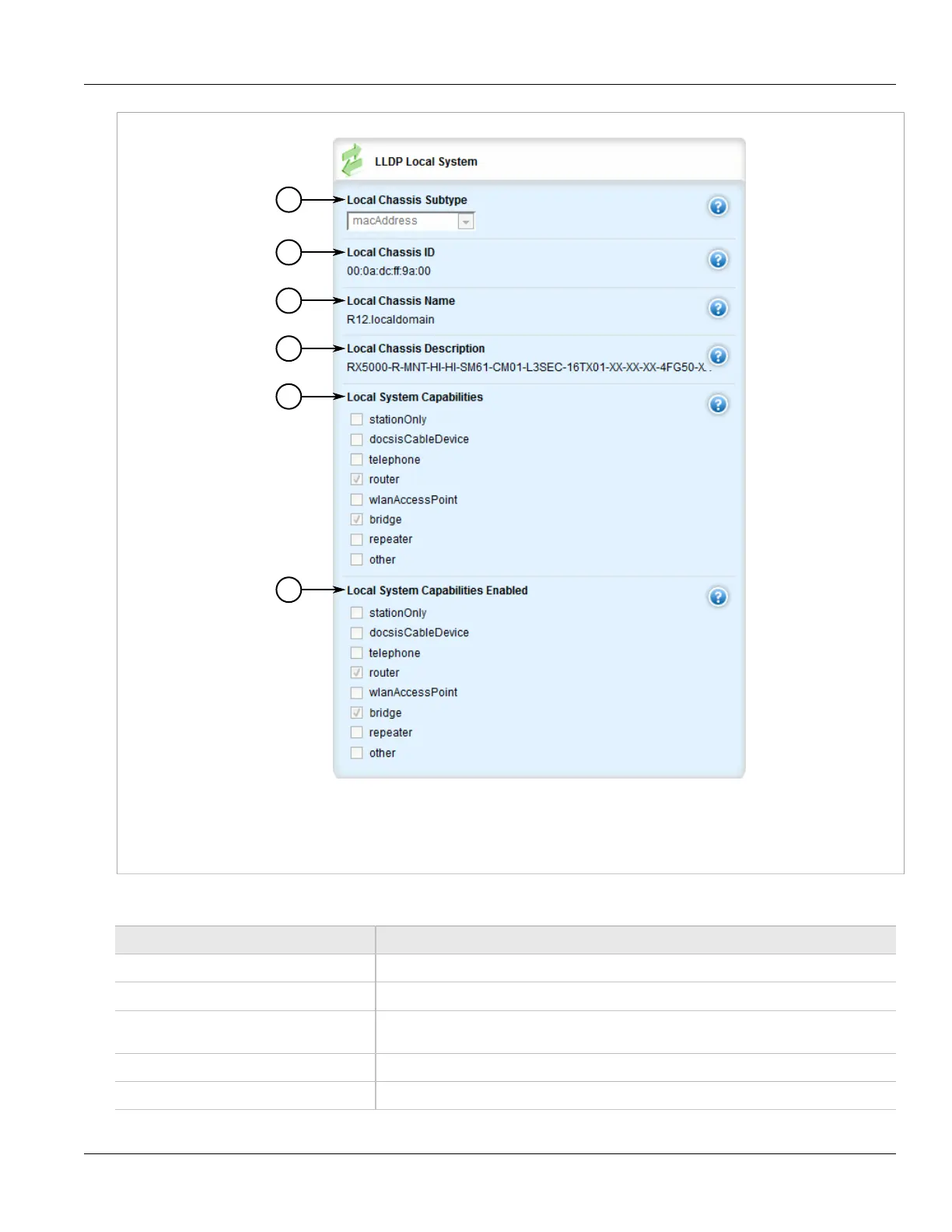 1. Local Chassis Subtype 2. Local Chassis ID 3. Local Chassis Name 4. Local Chassis Description 5. Local System Capabilities