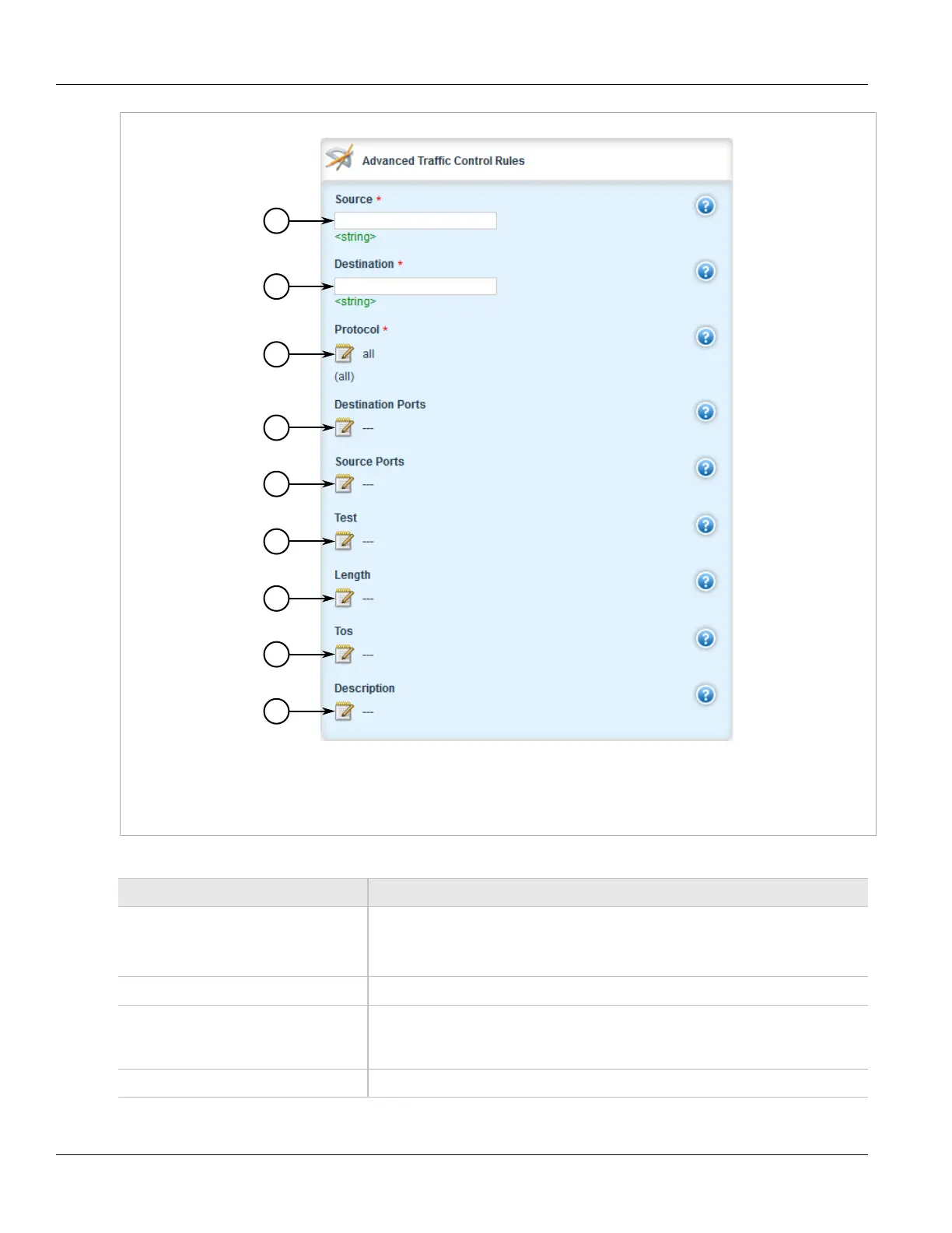 1. Source Box 2. Destination Box 3. Protocol Box 4. Destination Ports Box 5. Source Ports Box 6. Test Box 7. Length