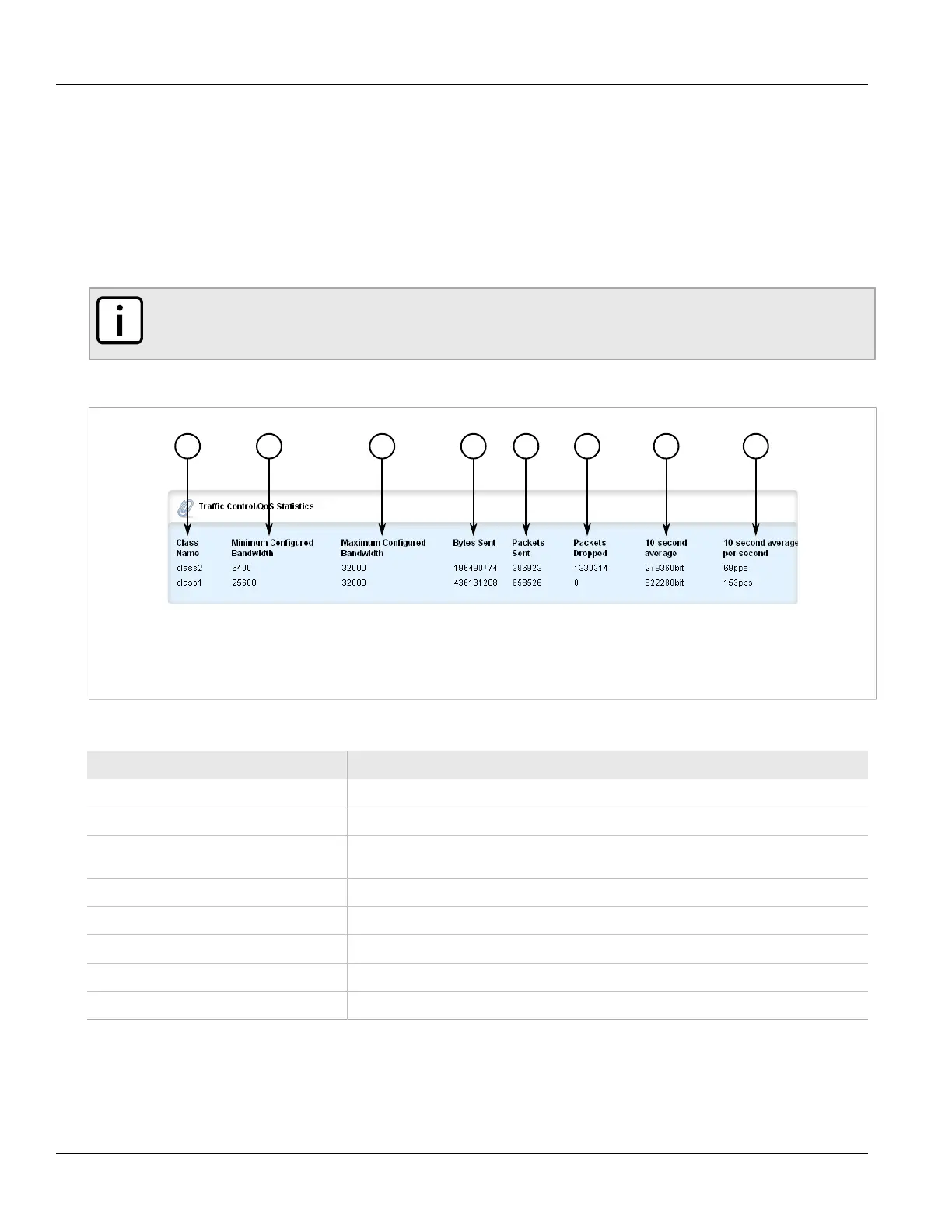 1. Class Name 2. Minimum Configured Bandwidth 3. Maximum Configured Bandwidth 4. Bytes Sent 5. Packages Sent