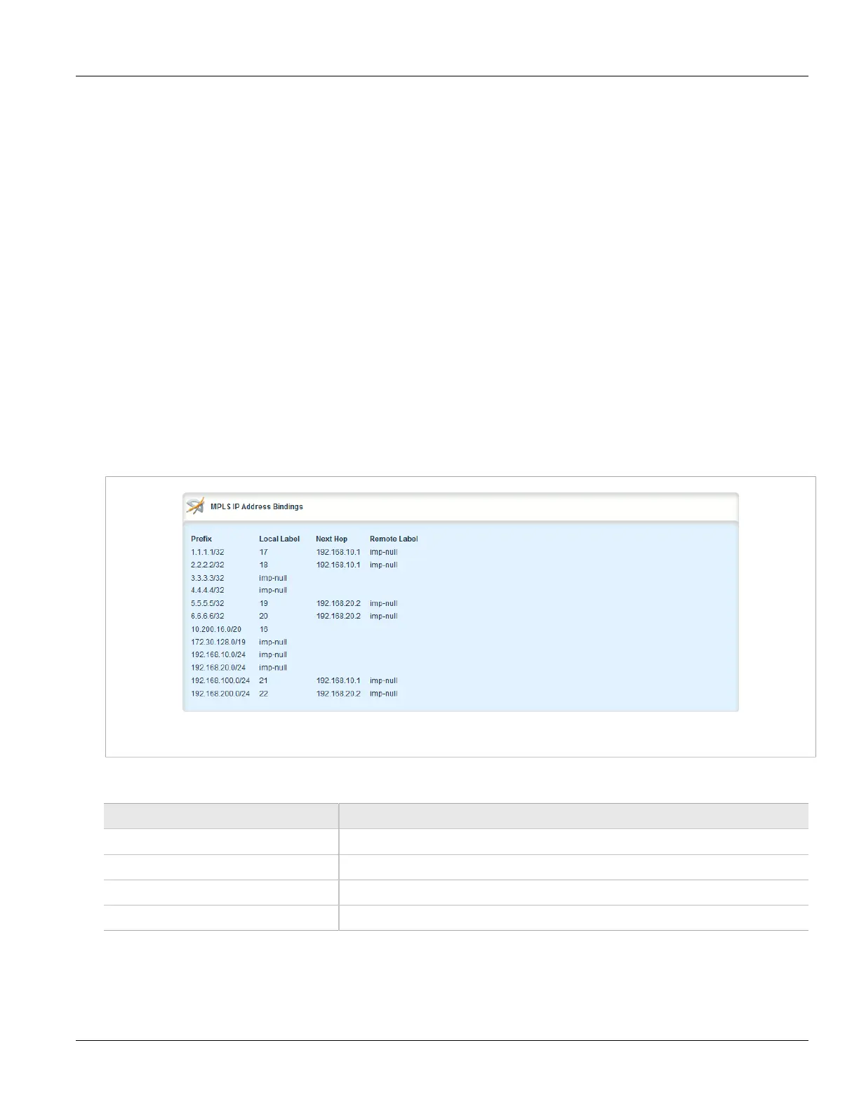 To view the status of the IP binding on the device, navigate to mpls » status » ip-binding. If IP binding has been