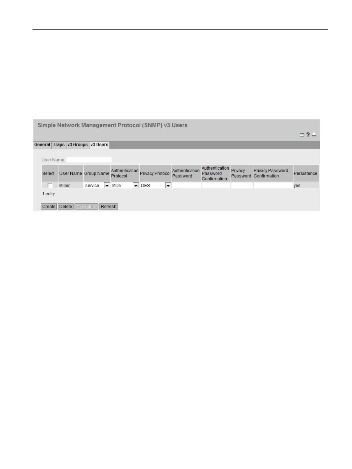 On the WBM page, you can create new SNMPv3 users and modify or delete existing users.
