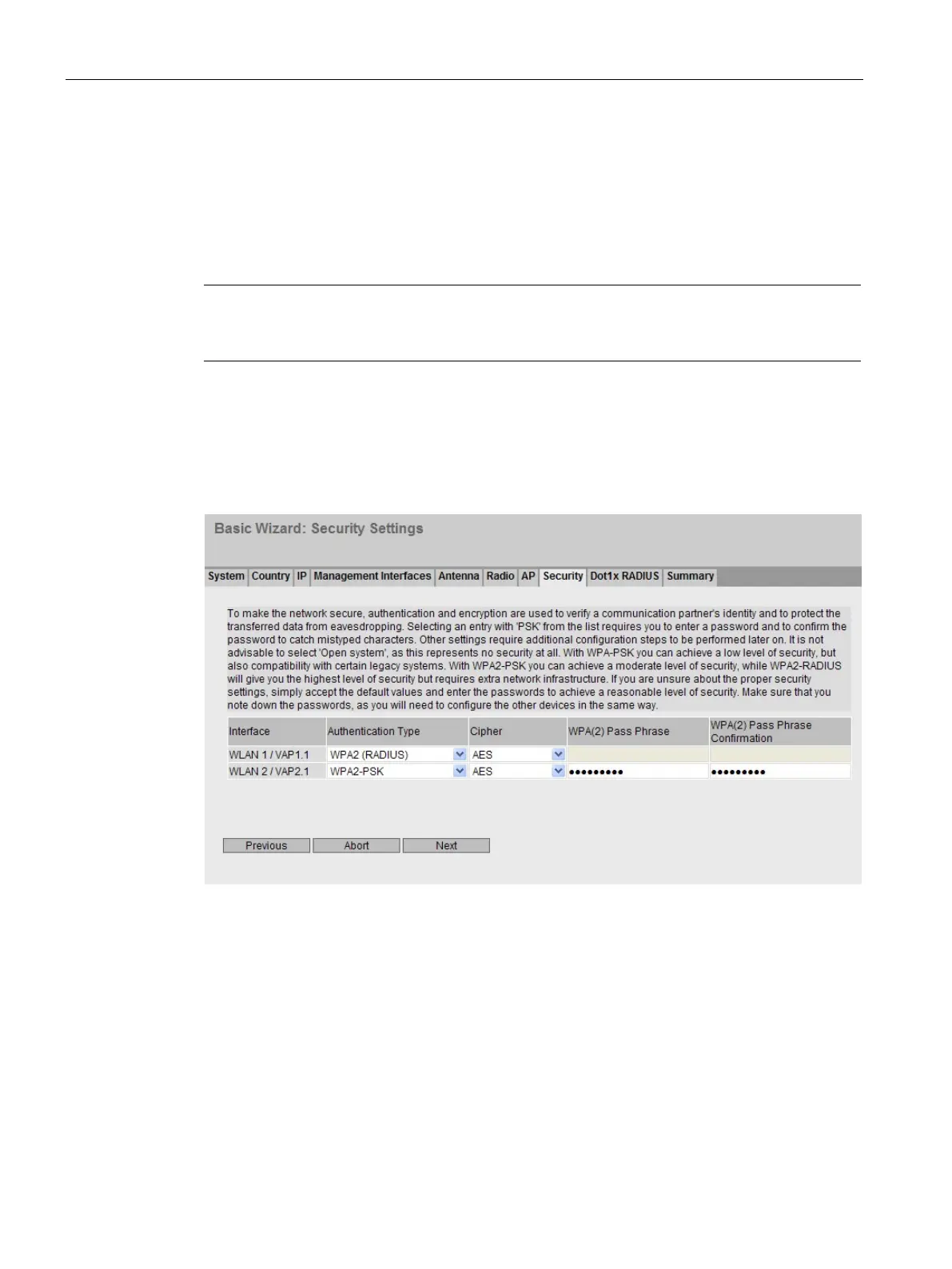 Use WPA2/AES, to prevent misuse of a password WPA2 (RADIUS) / WPA2-PSK with AES