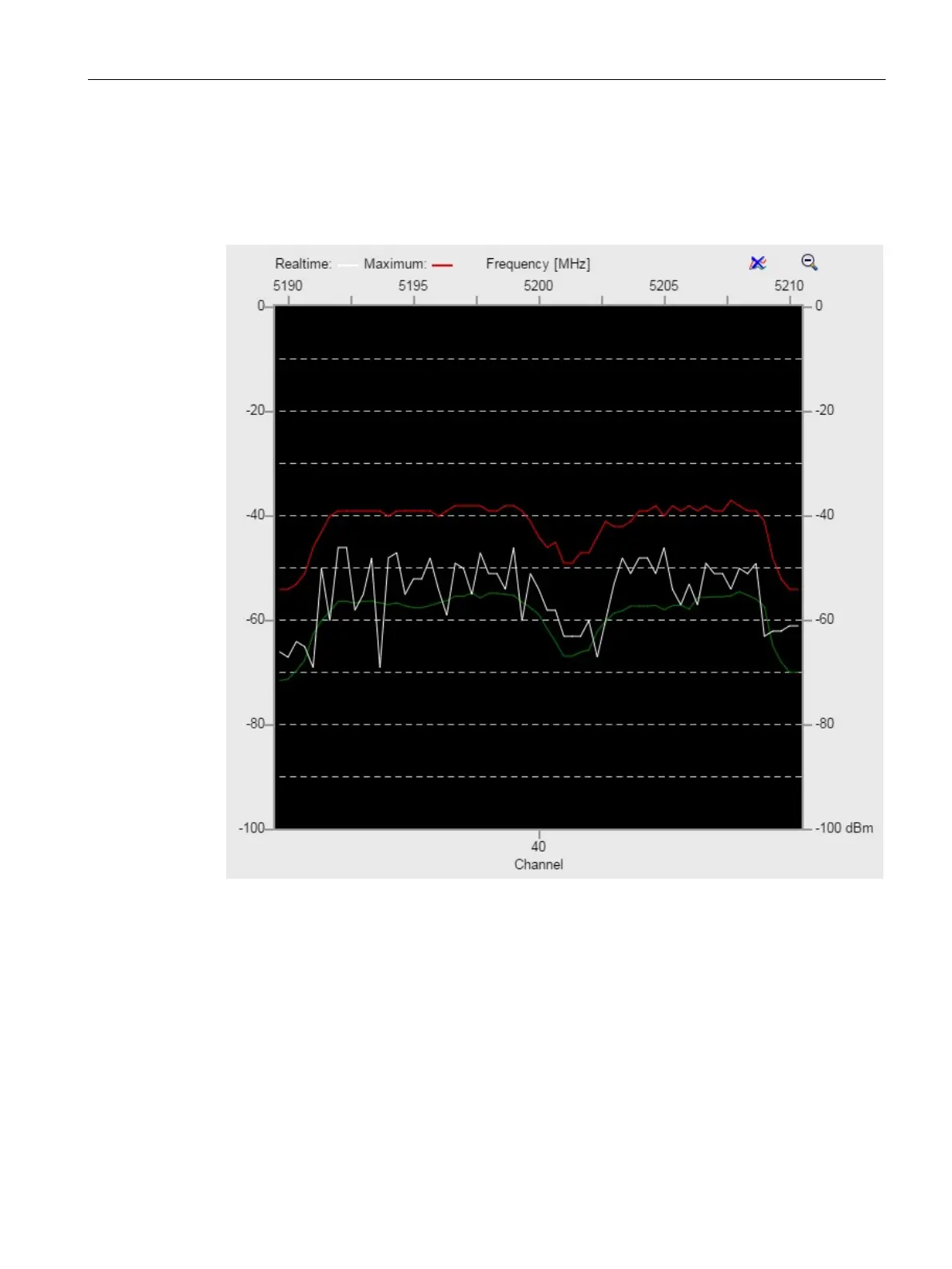 In all graphics, the lower x axis shows the channels around the selected center frequency for