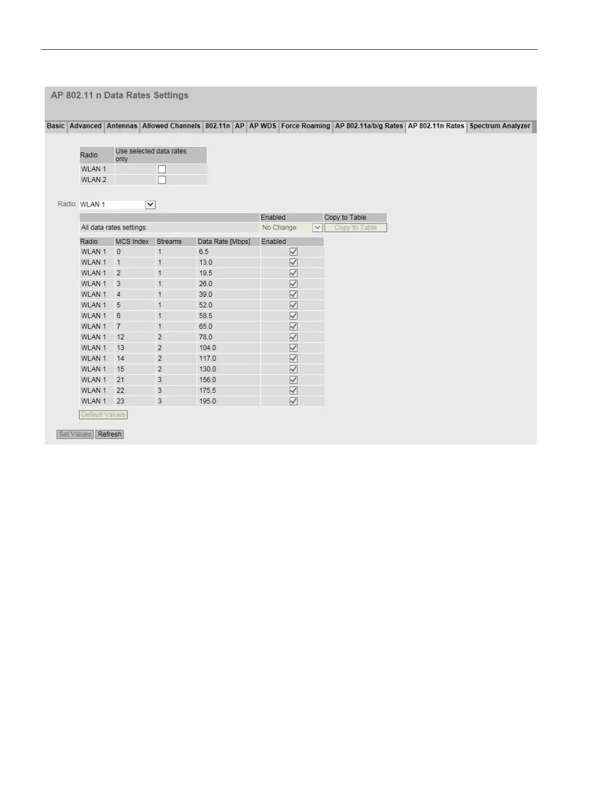 In this drop-down list, select the WLAN interfaces displayed in Table 3 (MCS Index).