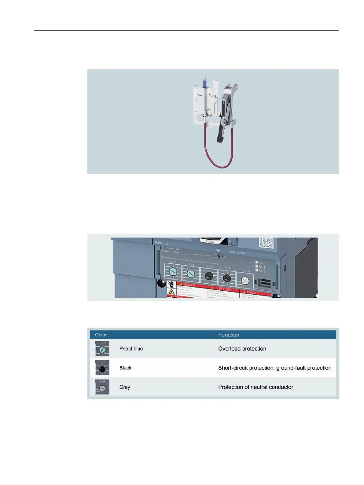 The control elements on the thermal-magnetic and electronic trip units are color-coded.