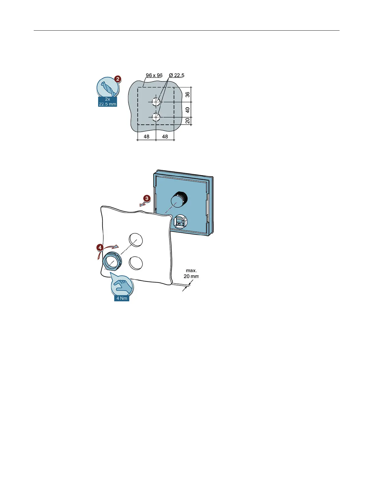 2. Drill two holes with a diameter of 22.5 mm at the point in the door where you would like to