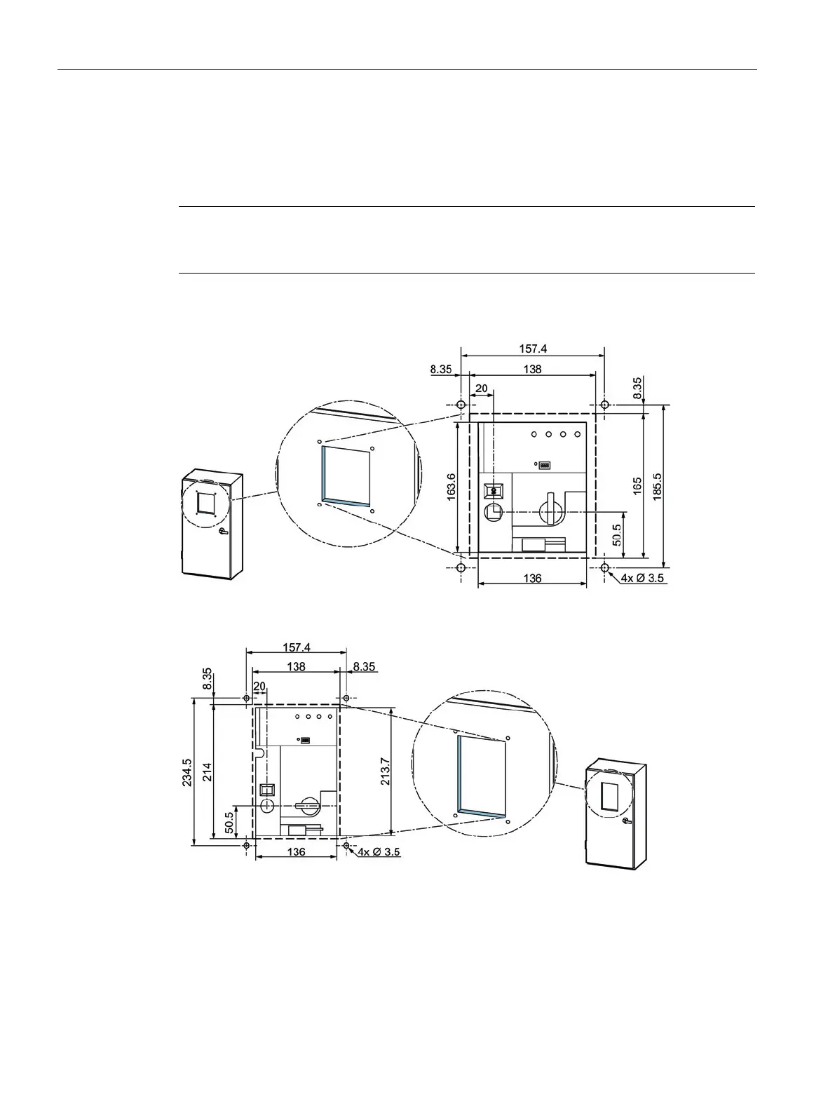The following figures show the dimensions of the cover frame for door cut-out for the 3KC4
