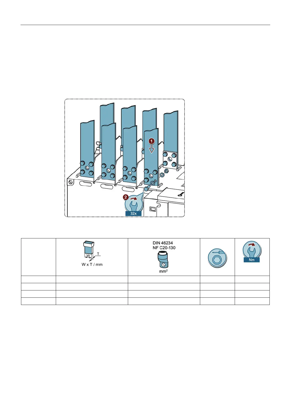 – For current ratings of 800 A to 1250 A with 4 bolts, 8 washers, and 4 nuts in each