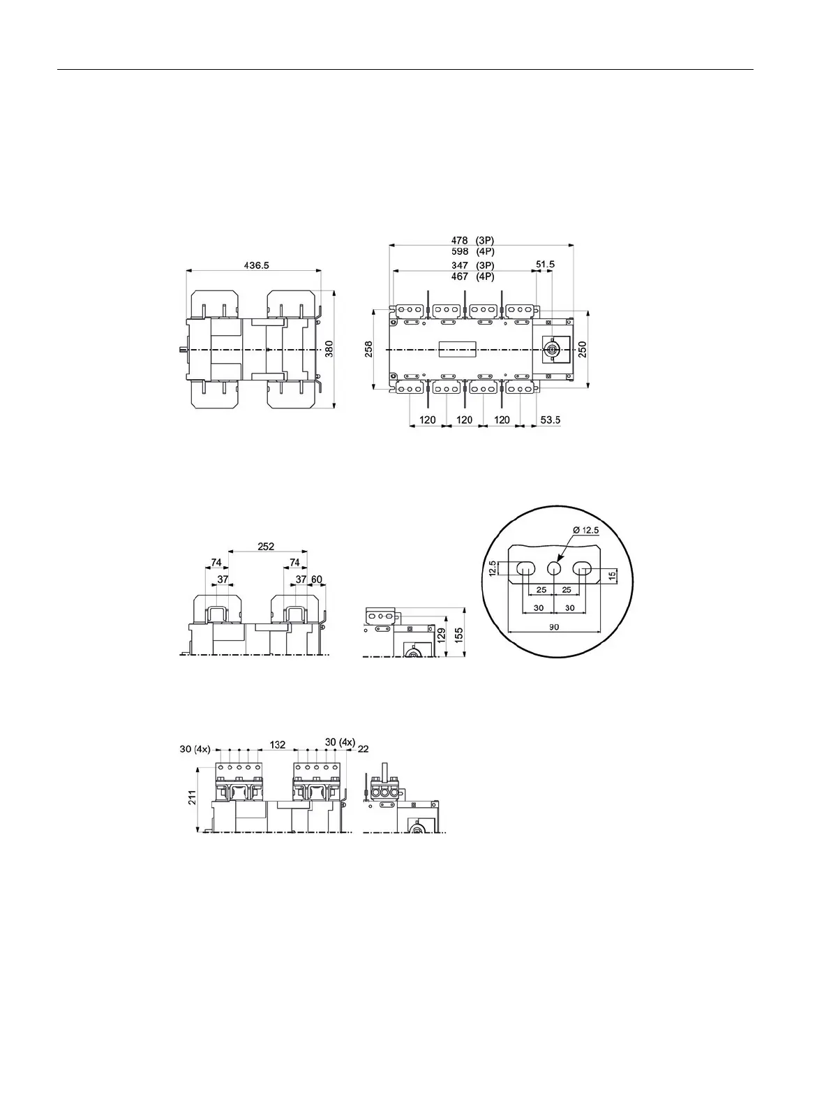 Use of the copper bar connection kit changes the dimensions of the 3KC4 and 3KC8 transfer