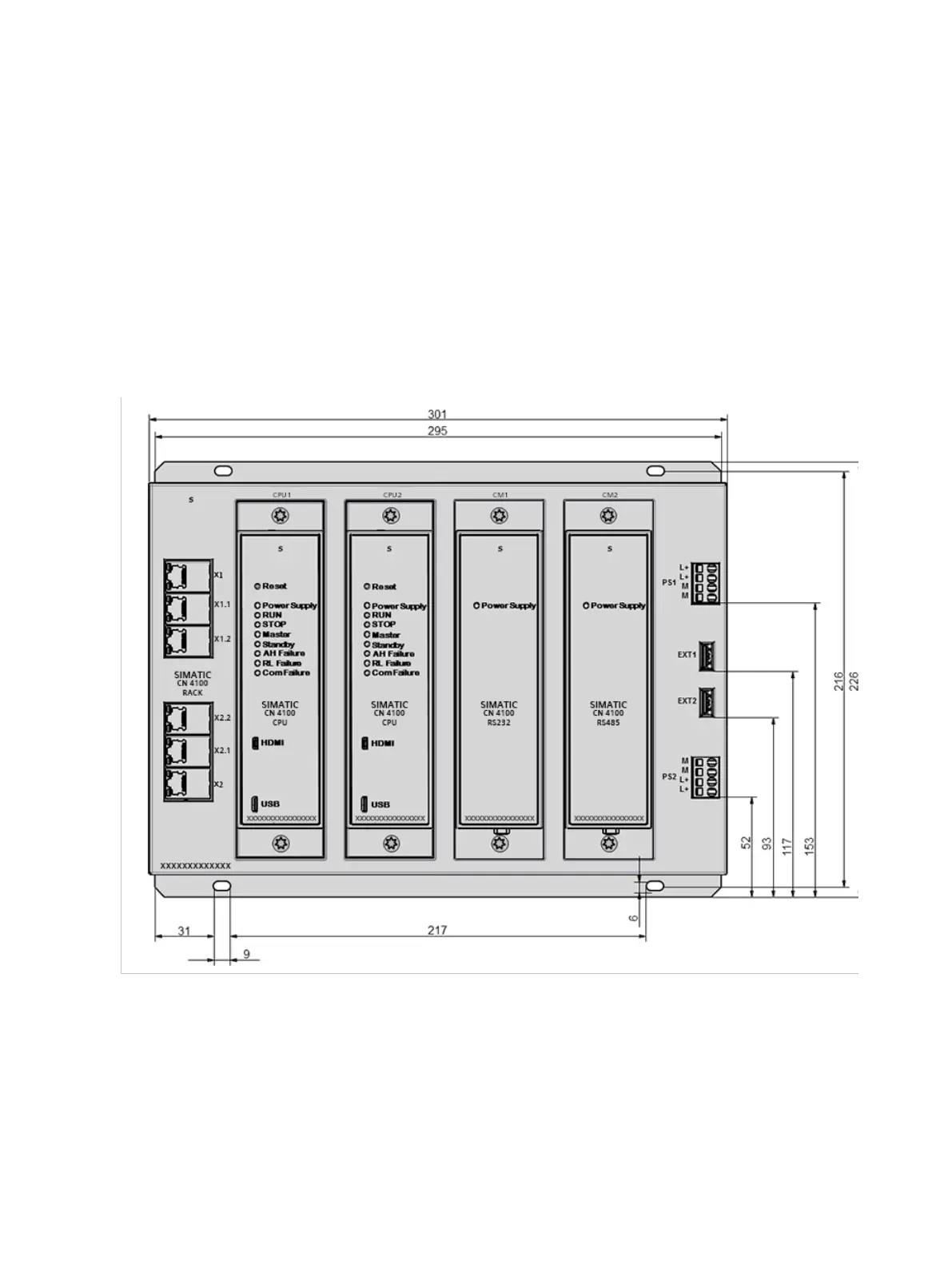 The following gures show the dimensions of the rack with four plugged-in modules (two CPU