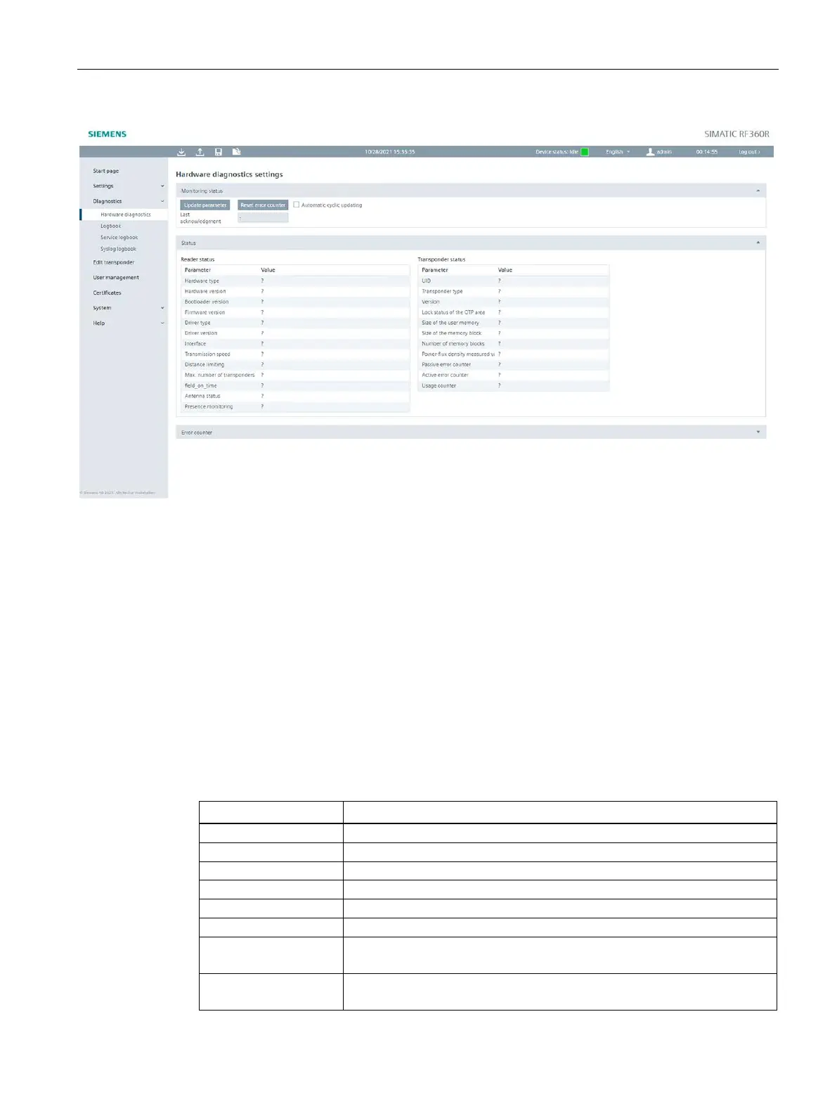 In this area you can update the reader and transponder parameters and reset error counters