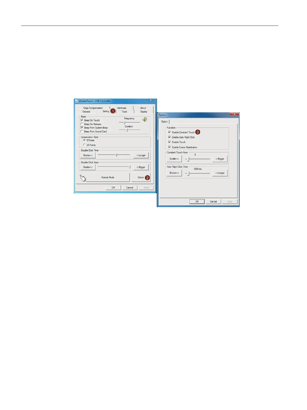 3. Select the radio button next to "Enable constant touch", and adjust the constant touch