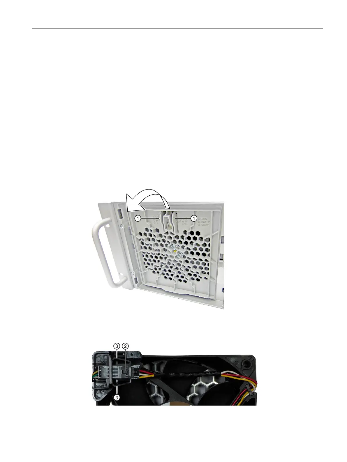 6. Press on the clip on the small fan cable plug connector ② and remove the connector from