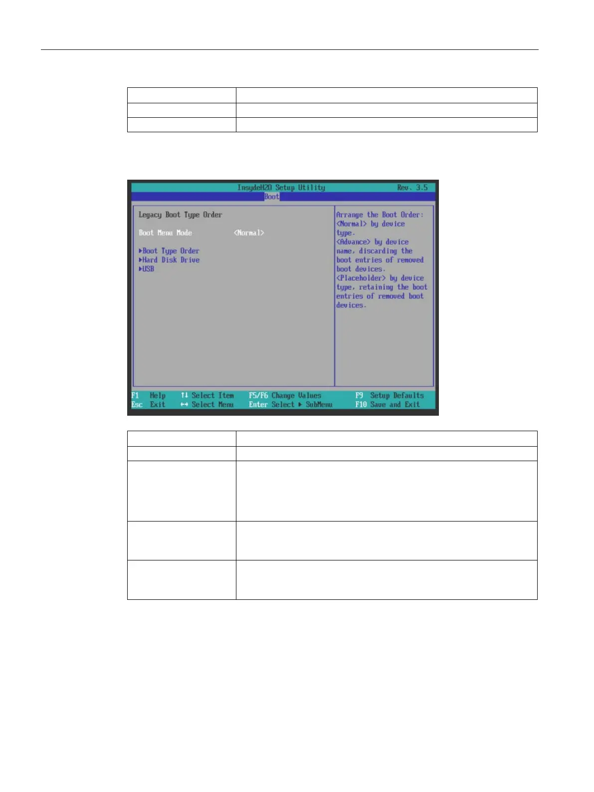 Legacy Boot Type Order Set the traditional boot order (Normal, Advanced, Placeholder).