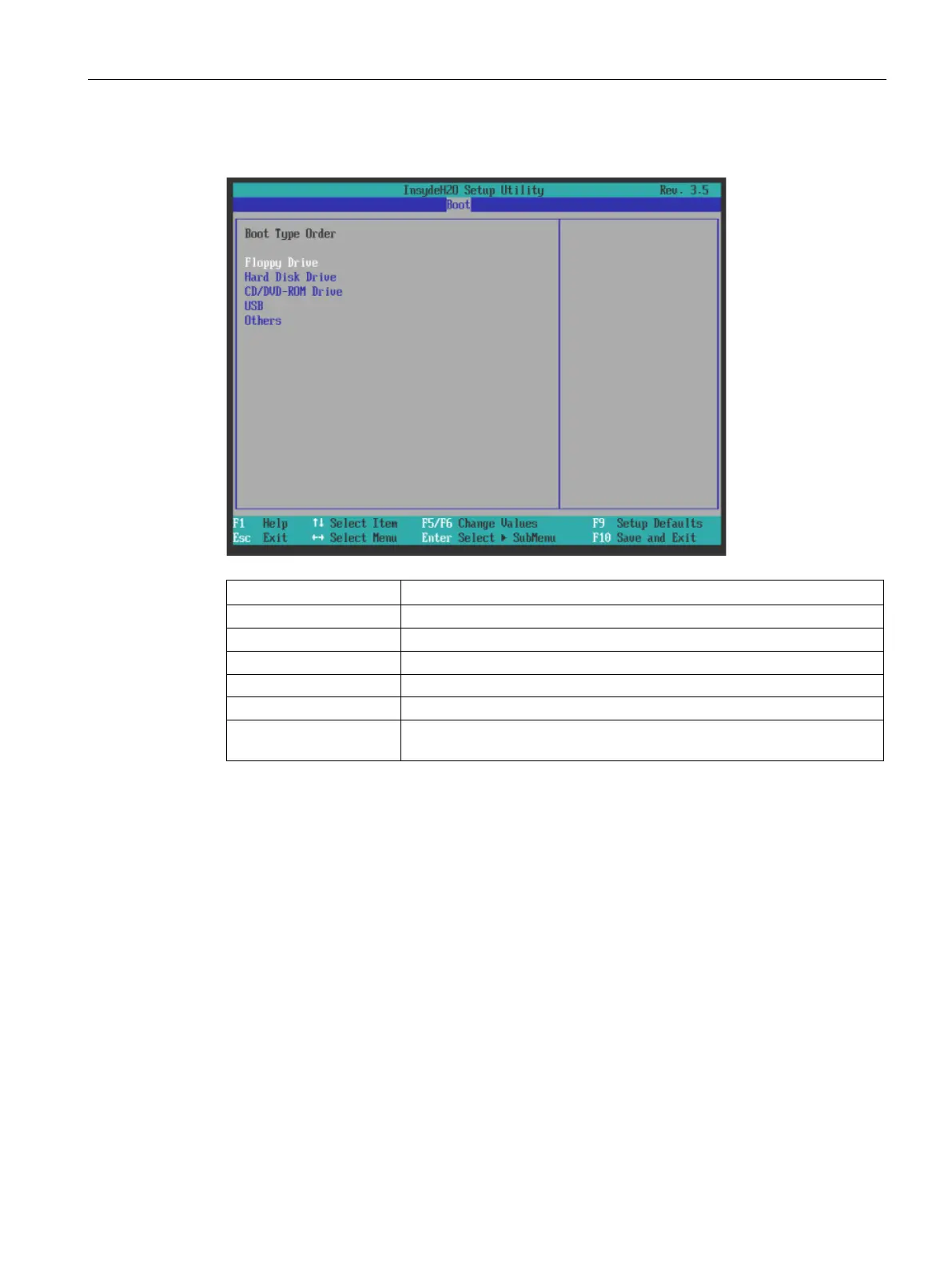 Others Setting the boot order within the Others group, for example, Remote Boot