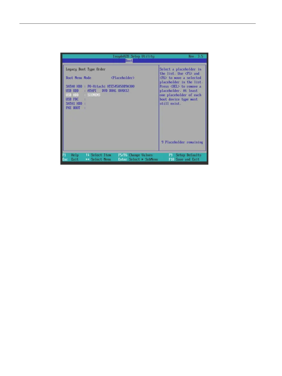 "Legacy Boot Type Order (Placeholder)" submenu