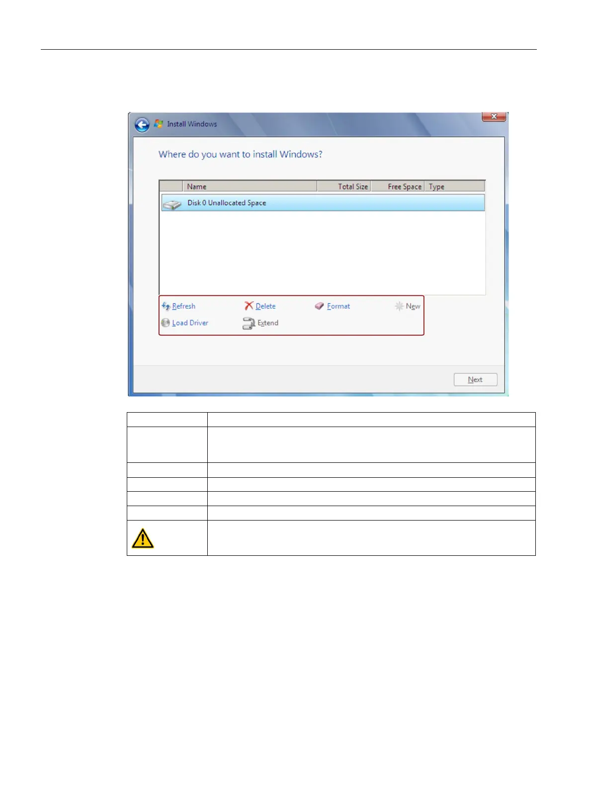 Windows installation window "Drive options (advanced)":