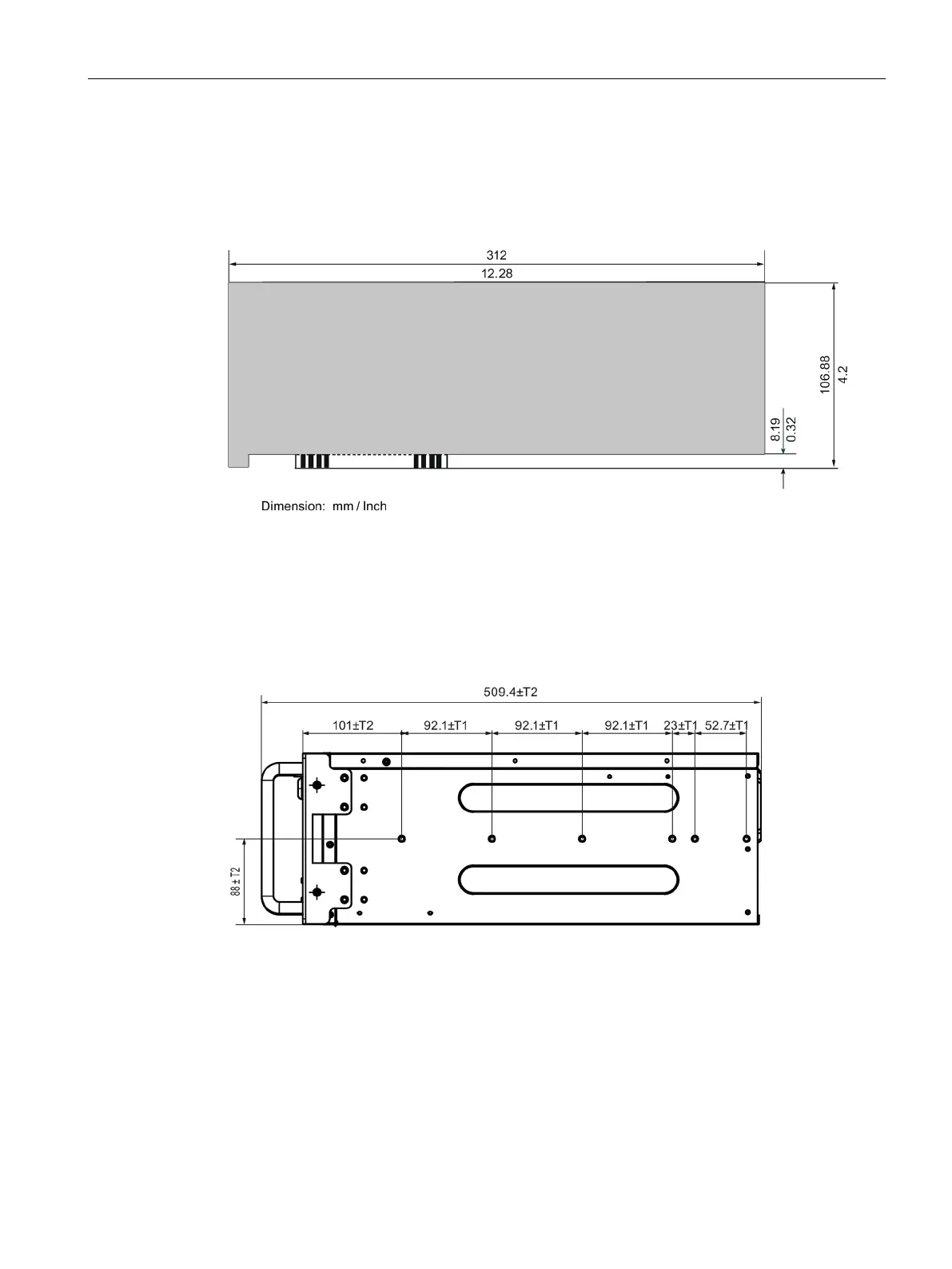 T2=Tolerances of ± (0.3mm)/(0.01")