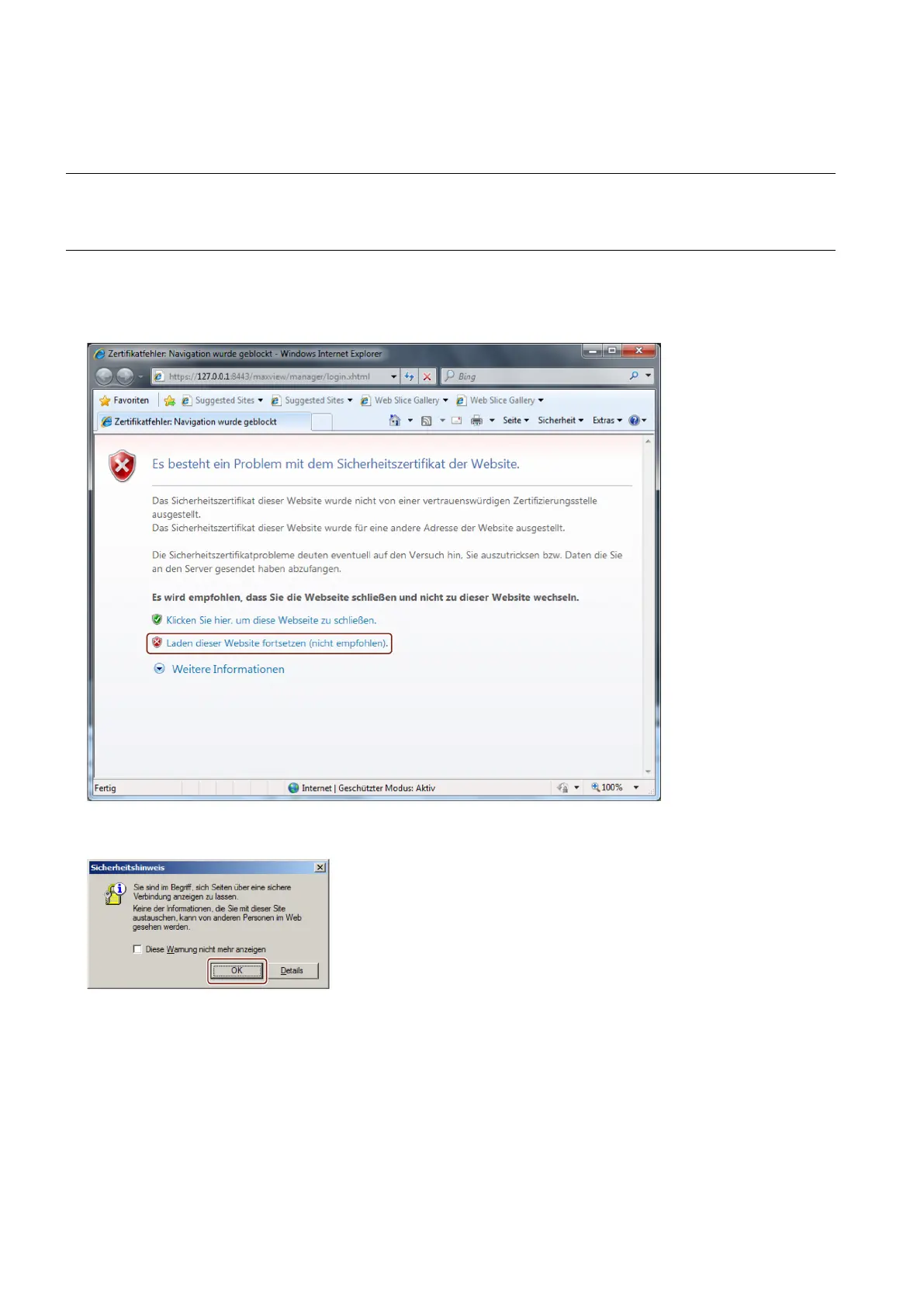 1. Beim ersten Aufruf des Adaptec maxView Storage Manager wird der Internet Explorer geöffnet und folgende Meldung