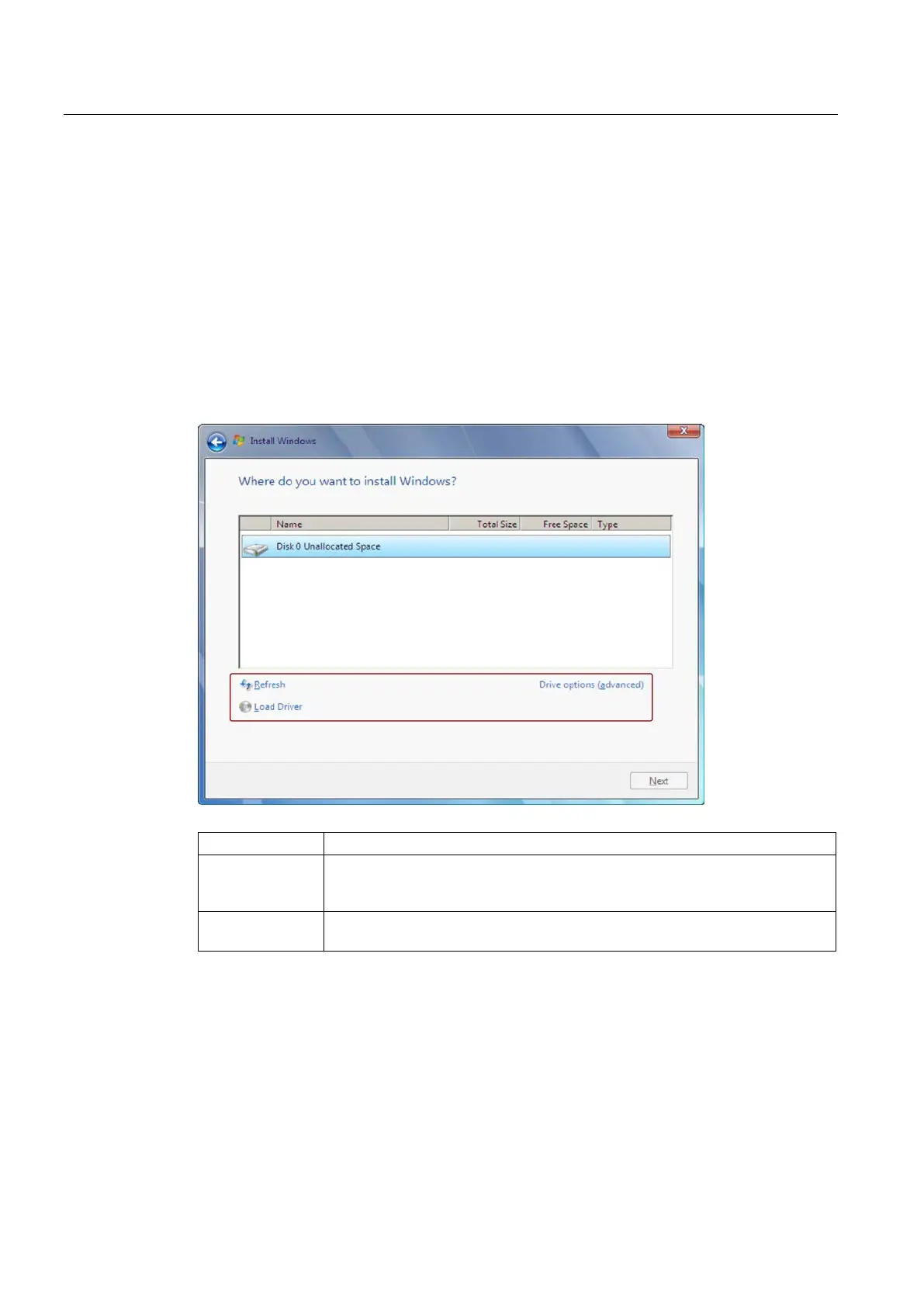 see figure "Windows installation window "Drive options (advanced)"".