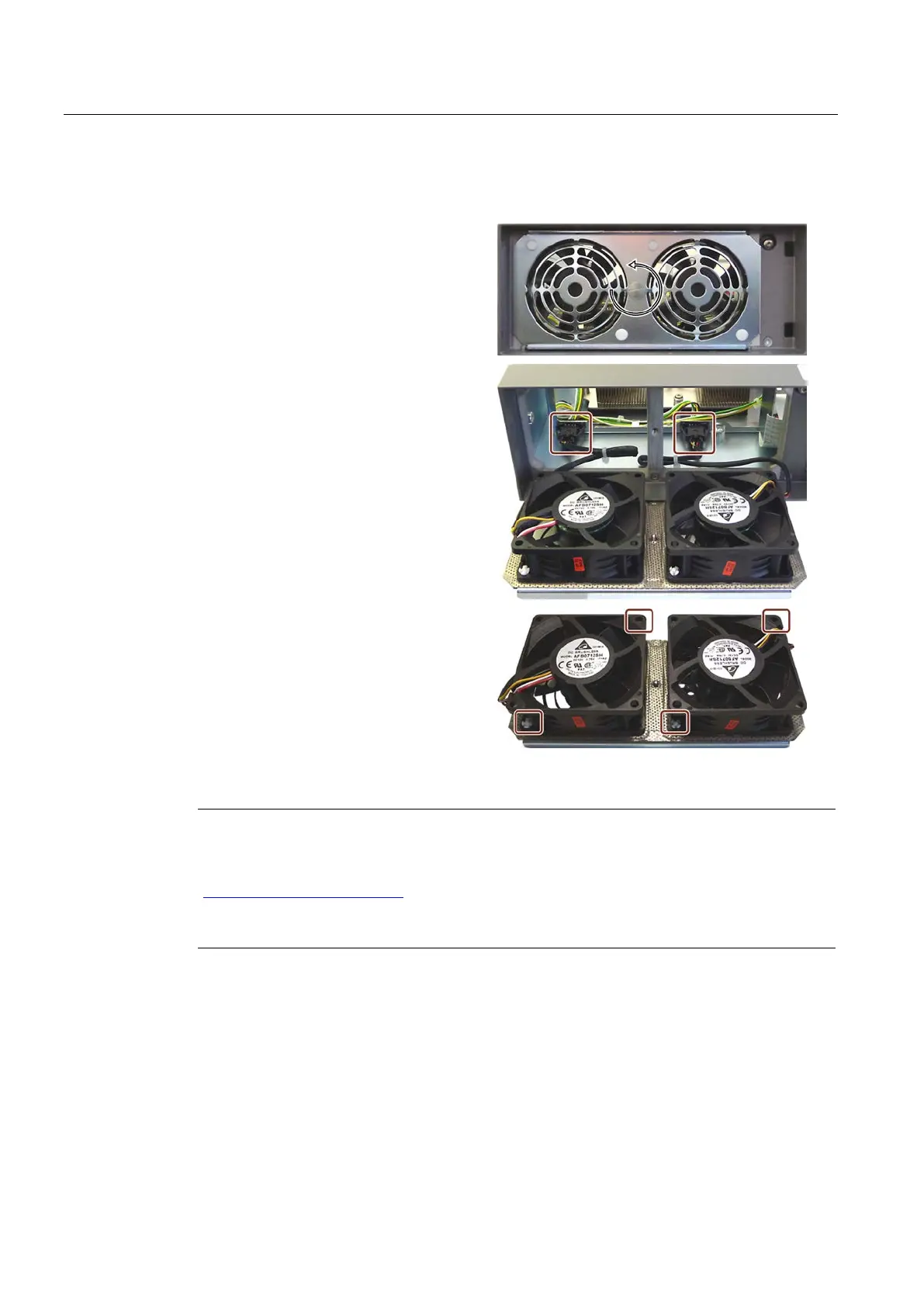 Ensure that position of the fans are the cable routing are correct, see the figure in the