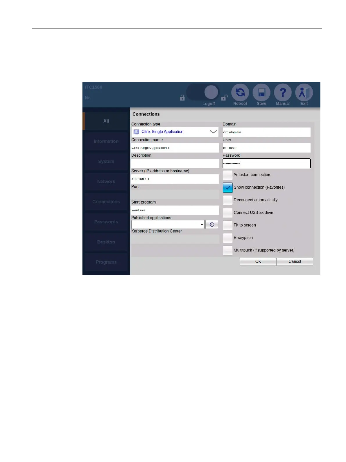 You specify all parameters of the Citrix connection including the application that is to be