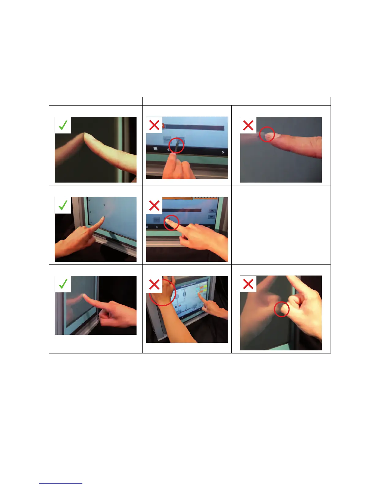 The following table shows a summary of the correct and incorrect operation of the capacitive touch screen.