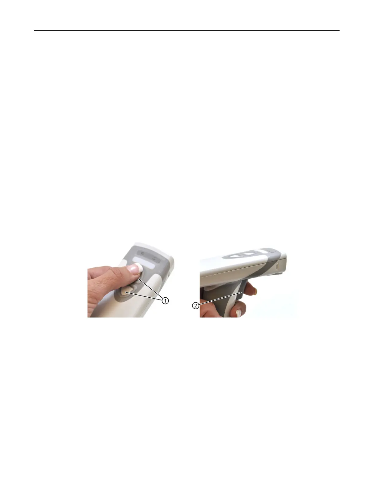 To turn on the device, press one of the buttons ① or the trigger ② and hold it down for 1 s.