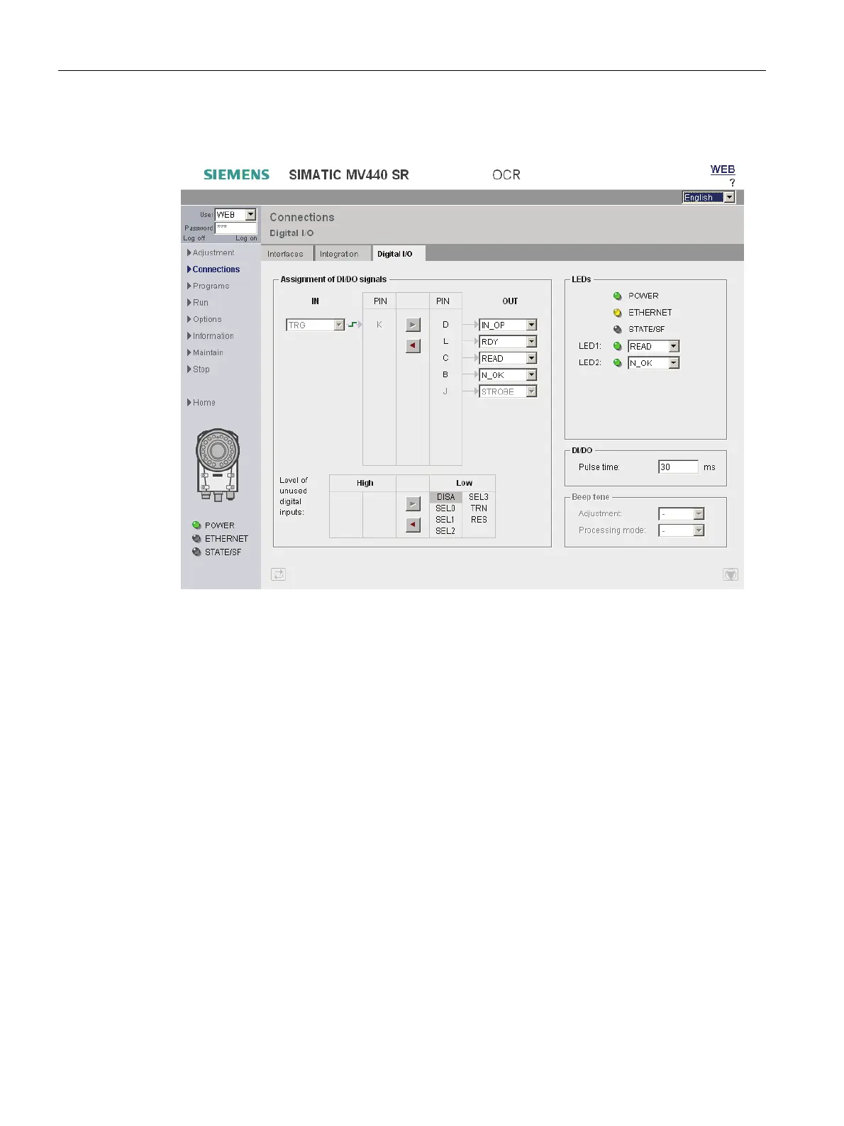 On the "Digital I/O" tab, you specify the assignment of digital inputs and outputs, of the LED