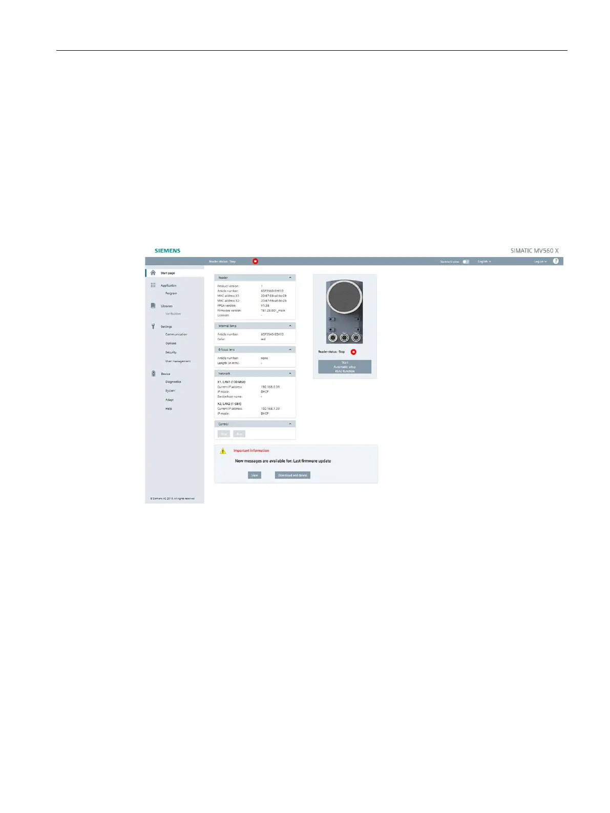 You are connected to the reader and the reader can be operated via the WBM. Below, you can
