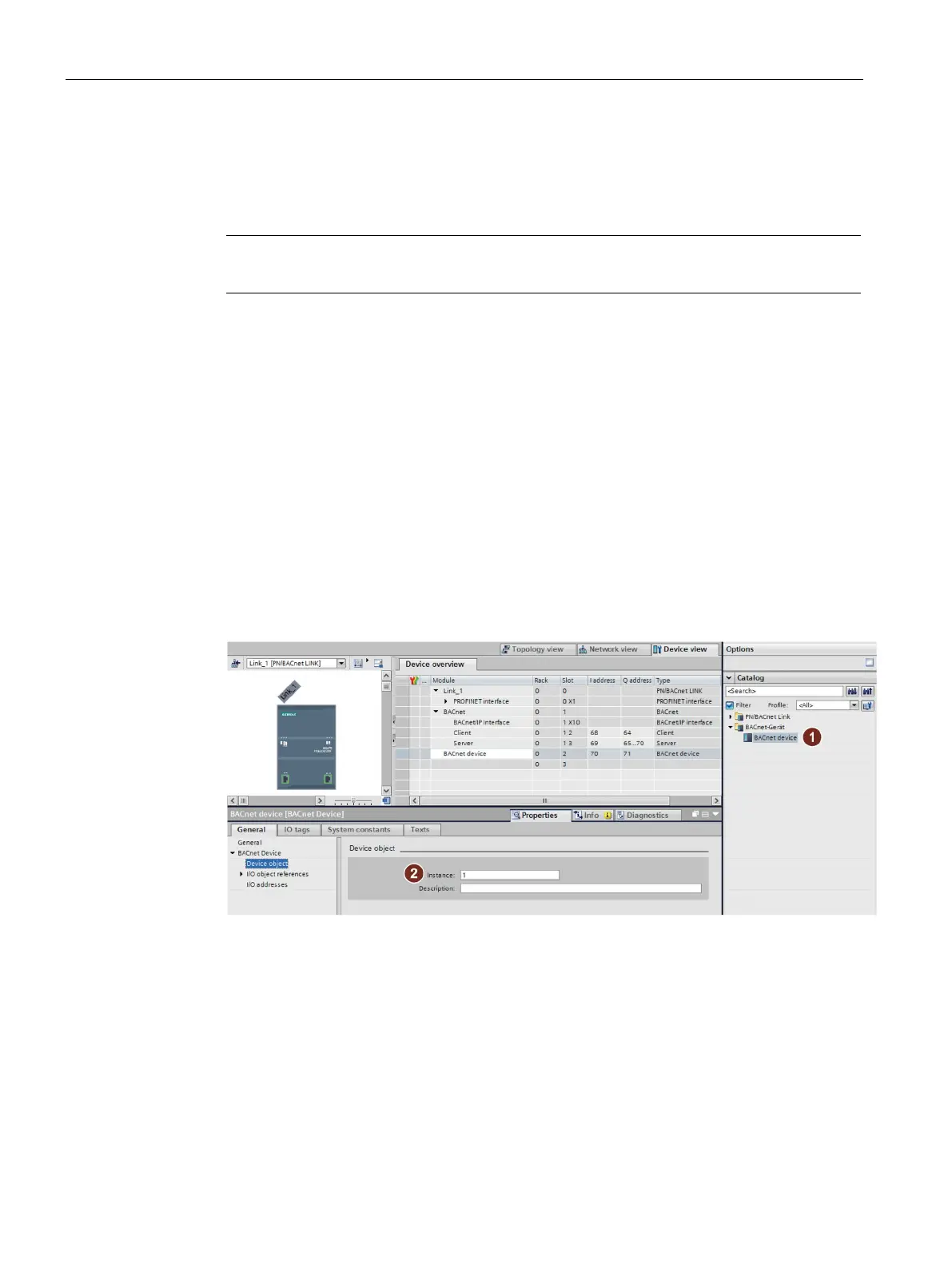 1. Double-click "BACnet device" ① In the HW catalog. This places a BACnet device as a