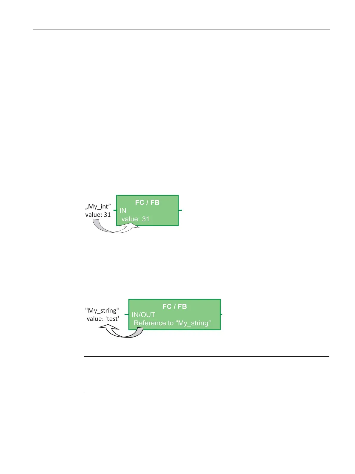 FBs and FCs receive parameters through the IN and IN/OUT interface types. The blocks