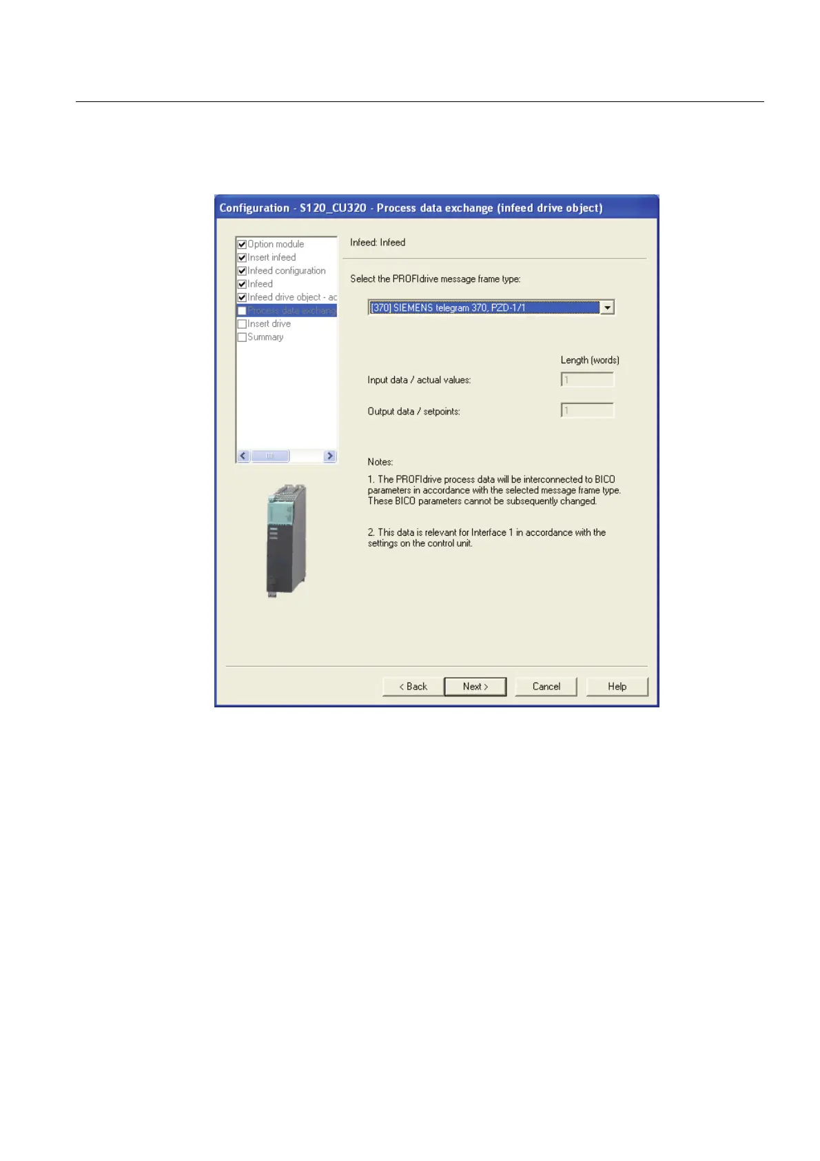 the "SIEMENS message frame 370 for the infeed". Click "Next" to confirm the setting.