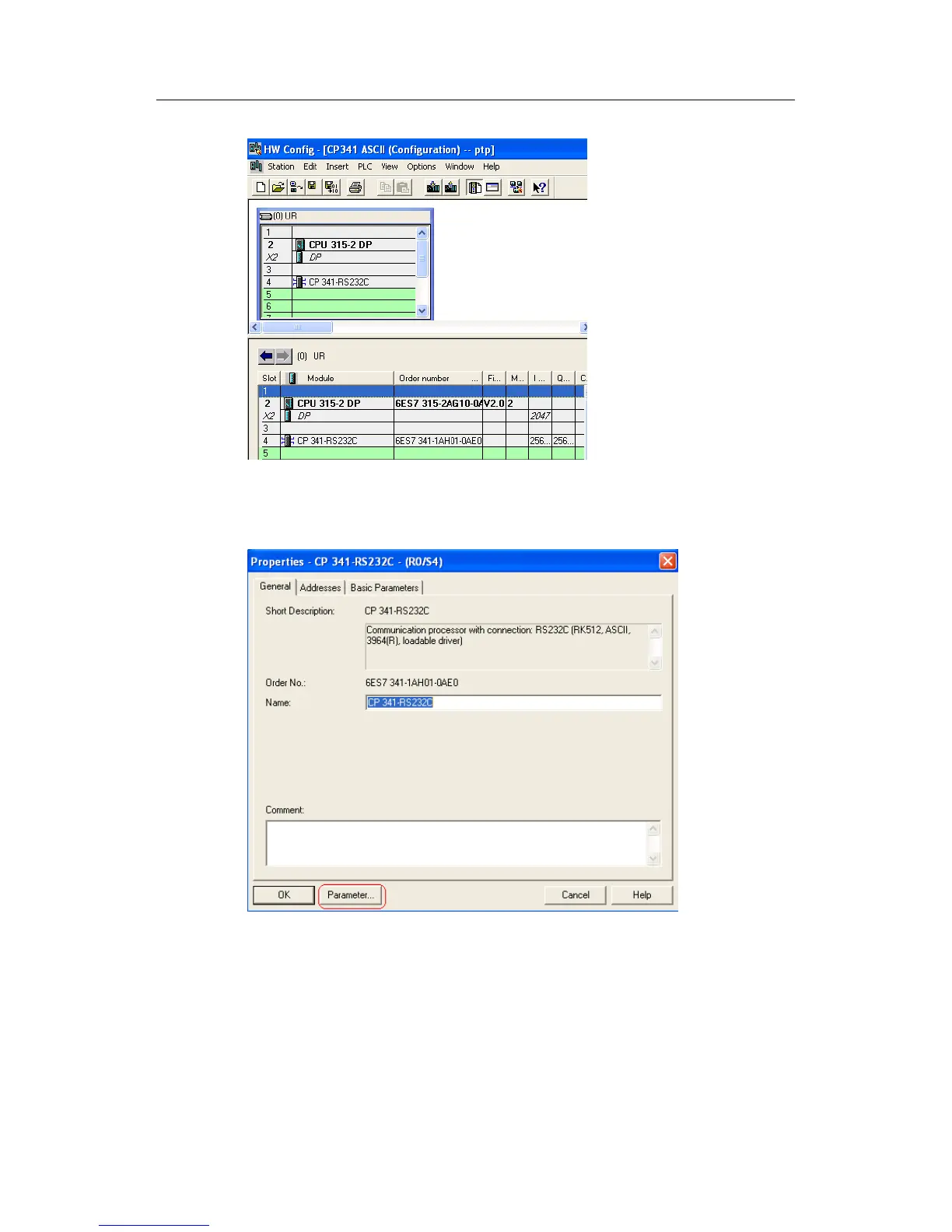 3. Double-click CP341 module, and click Parameter... to configure CP341